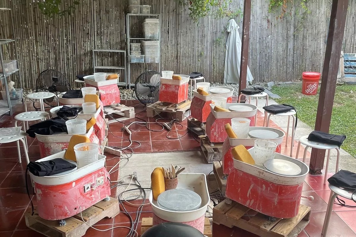After buying a pottery wheel and diving deep into YouTube to learn about working with clay, they moved to an Edgewater property with a mango tree-shaded backyard and an Airbnb space. They thought ceramics classes would be fun to offer guests, but two months after their first class with friends, the two had already quit their full-time jobs in tech to build a pottery school.