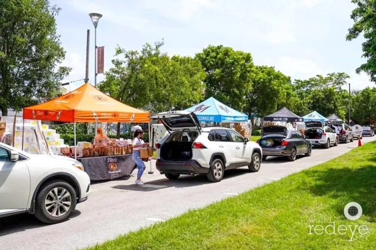 Tito’s Handmade Vodka teamed up with the Miami Marlins Foundation and Farm Share to give away 24,000 bottles of hand sanitizer to the Miami community for free on Thursday afternoon. Farm Share, who’s on a mission to ensure that no Floridian goes hungry and no food goes to waste, also distributed 2,000 boxes loaded with 20 pounds of food. Photo courtesy of WorldRedEye.com