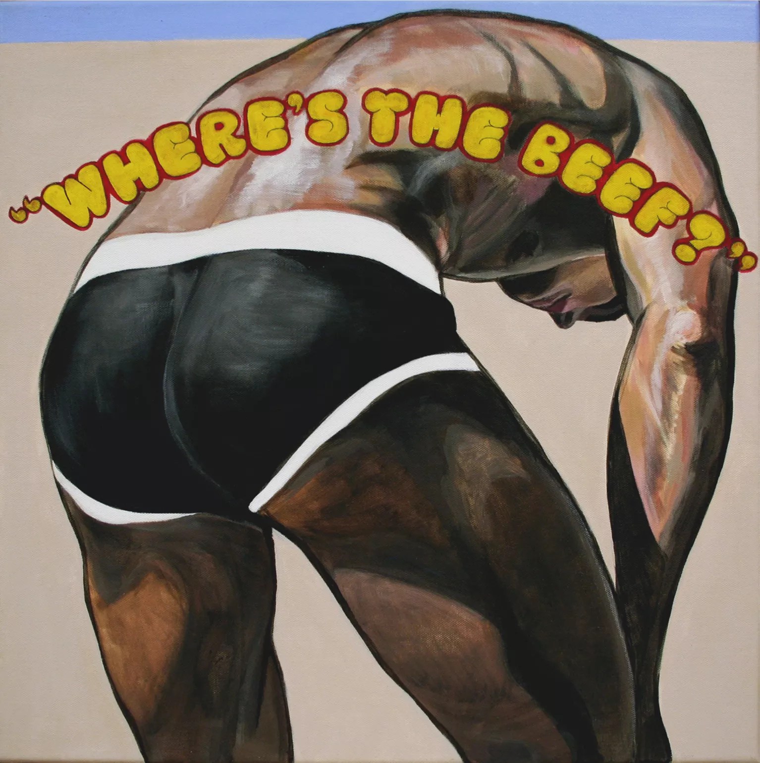 Painter Nicolas Glenn has also borrowed from pop art to create his tongue-in-cheek canvases. His pieces marry text and image, creating a painting suffused with strong and direct messaging. Often resembling a piece of advertisement, his paintings address the commercial exploitation of the body in the media.