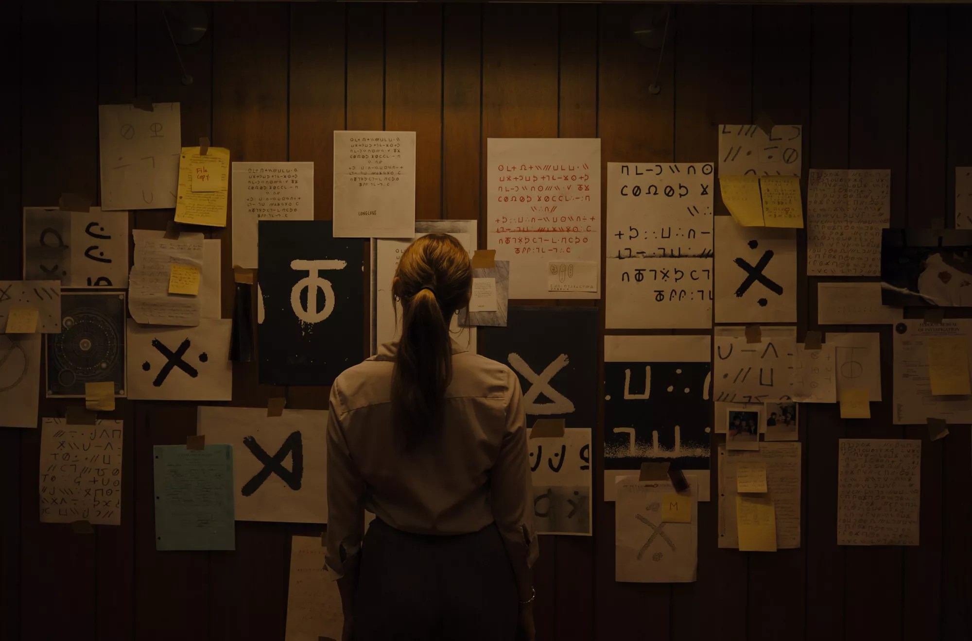 The FBI has been chasing the madman for years to no avail when “highly intuitive” rookie agent Lee Harker (Maika Monroe) steps up to the plate. Harker has a quiet, focused personality and a strained relationship with her religious mother (Alicia Witt). She soon deciphers the Zodiac-esque coded letters signed by Longlegs found at each crime scene and finds Satanic symbols and passages from the Book of Revelation. Then she herself receives a letter from Longlegs.
