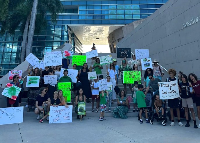 Dozens of Aventura residents gathered outside city hall to protest the city’s plan to build pickleball courts at Founders Park South.
