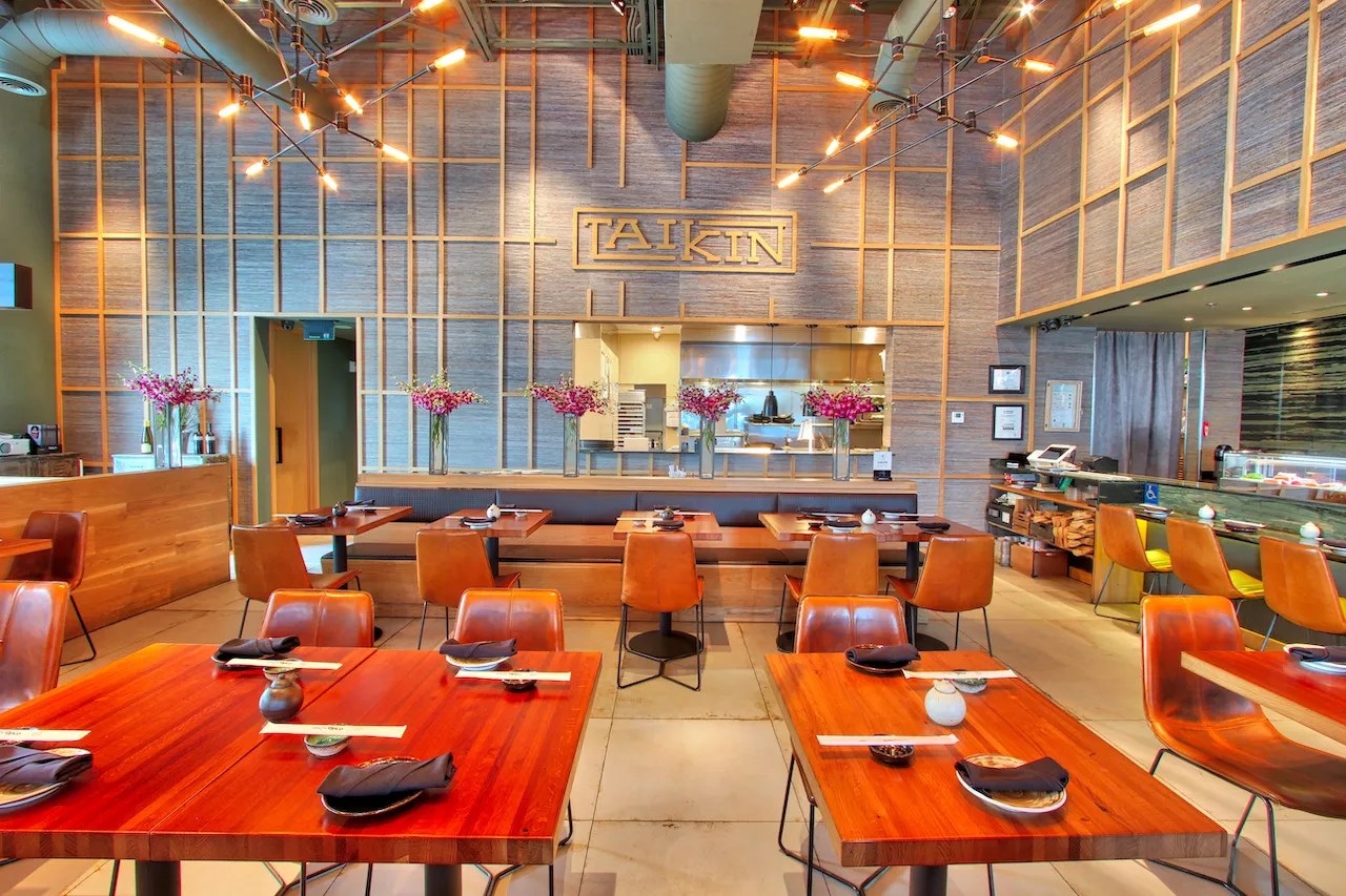 Sprawling over 2,600 square feet, Taikin (the Japanese word for “fortune”) evokes a casual atmosphere, with an open kitchen and a décor done in red and brown. The dining room seats 120 between its indoor and outdoor areas, livened up by rotating DJ sets.