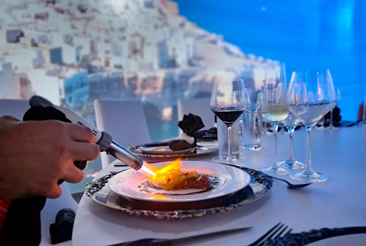 As diners experience the rolling hills of Italy or fly over the waterside scenery of Greece, the journey is set to the tunes of various native songs and educational narration as videos stream across the walls and dining tables. All the while, servers present diners with dishes and wine representing each country.