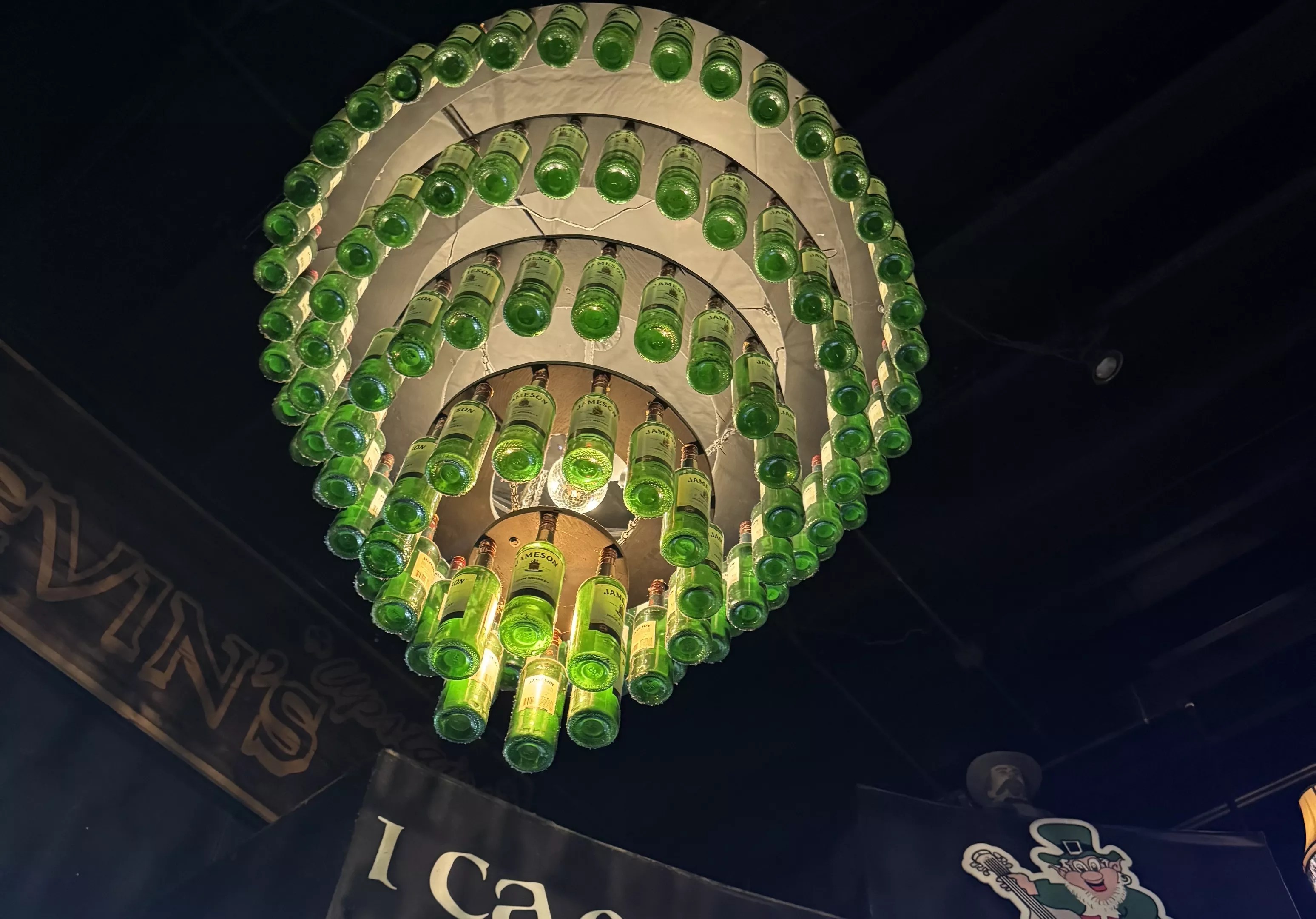 A chandelier made up of Jameson botles hangs from the ceiling of Irish Kevin’s in Key West.