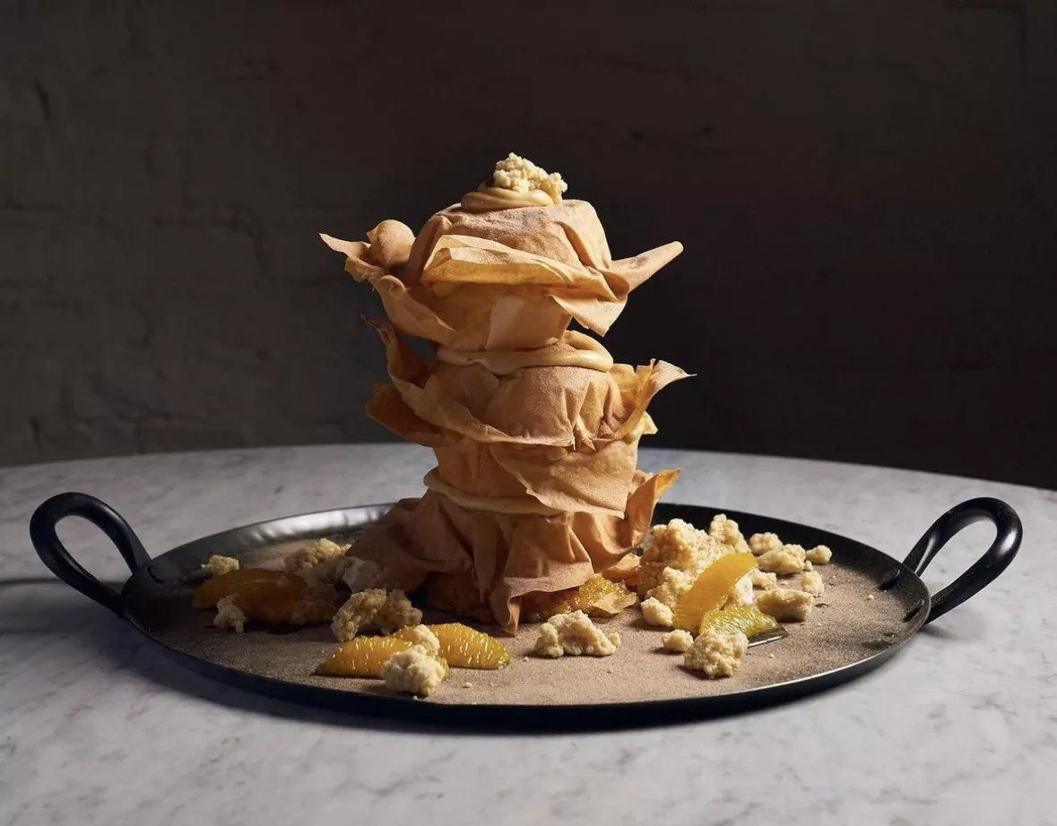 Aba’s bougatsa is made with phyllo pastry, vanilla custard, cinnamon sugar streusel, and orange blossom.