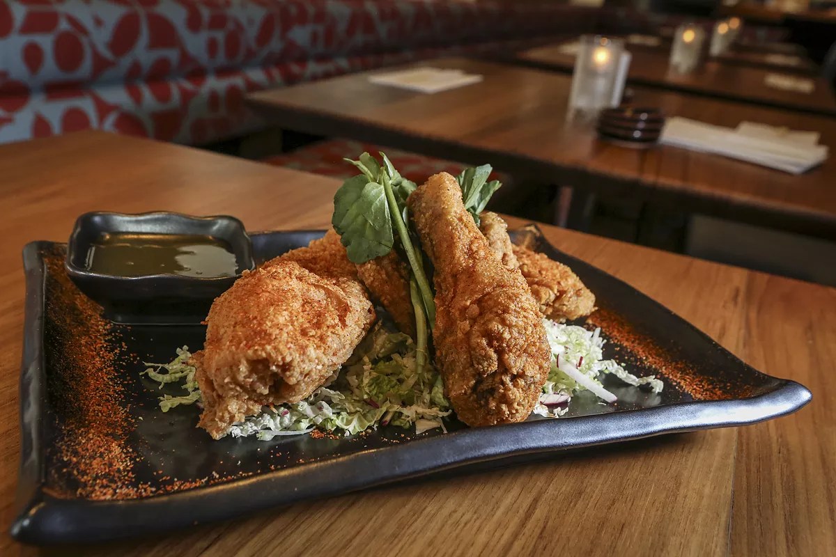 Three years ago, they decided to open a sushi restaurant in Miami Beach. What resulted is a rare, happy oasis. The Plymouth Hotel sits two blocks from Collins Avenue, far enough that the blaring traffic and drunken tourists are mostly out of earshot. Inside, chunky furniture in rich earth tones shaded by leaning palm fronds evokes the art deco era. That aesthetic is reinforced by bold murals that combine art deco with gothic imagery. Cross into the understated restaurant and you’ll likely hear the staff bellow out “Irasshaimase!” for a Japanese welcome. The room is covered in narrow onyx brick, bookended on one side by a low-backed banquette with a red floral pattern. The main source of light emanates from the sushi bar, where a half-dozen chefs toil. Blue Ribbon fried chicken Photo by CandaceWest.com
