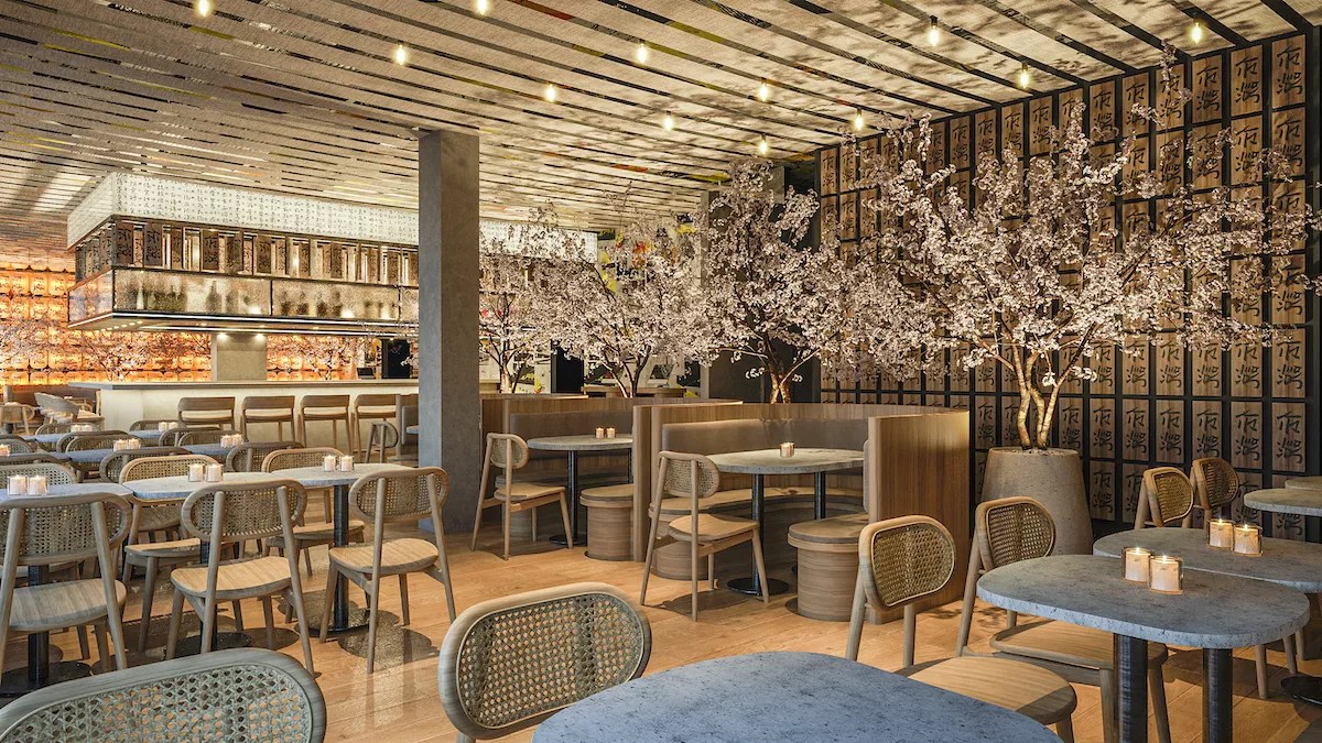 In Vazquez’s words, it’s more of a party at Paperfish Sushi’s South Beach site. Nestled amid Mediterranean-infused and pastel businesses, the restaurant has a noticeably Japanese-meets-Peruvian appeal, with visual highlights including towering cherry blossom trees, soft lighting, and contemporary gold and brown accents.