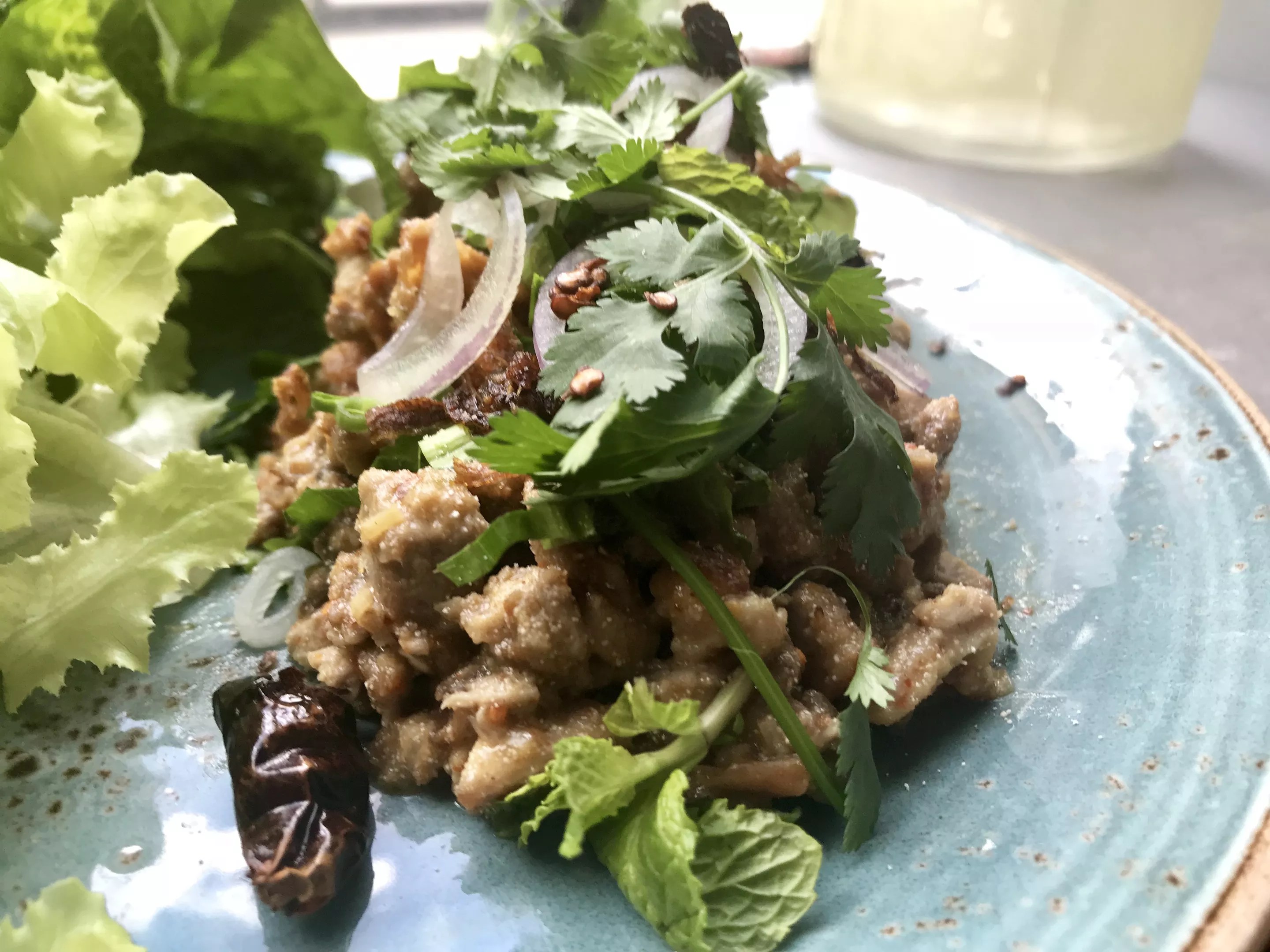 Some of the finger-friendly foods include duck laab – chopped duck meat seasoned with fish sauce, lime juice, palm sugar, chili powder, and toasted rice powder and served alongside lettuce leaves – and banana-leaf-wrapped grilled branzino.