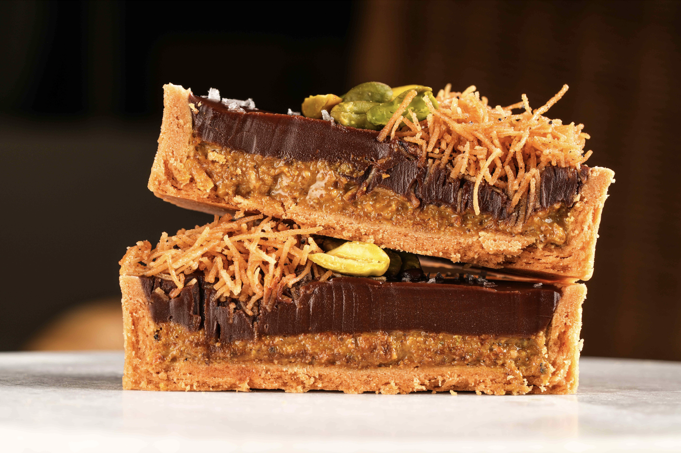 The dinner menu features kumamoto oysters with harissa mignonette and Meyer lemon, mussels saganaki with feta cheese and chives, and whole snapper prepared two ways. The kitchen also turns out grilled leeks with stracciatella and sumac, roasted cauliflower with tahini and pomegranate, and hanger steak with harissa roasted carrots.