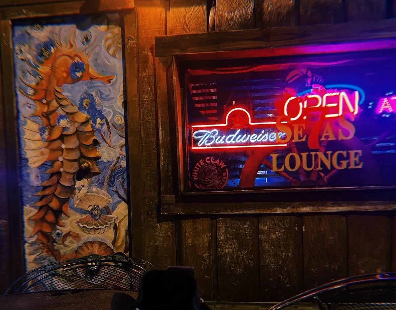 Unfortunately, this specific mural was painted by a frequent customer. “The seahorse was made by this local artist who is also a regular at the bar for karaoke,” he says.