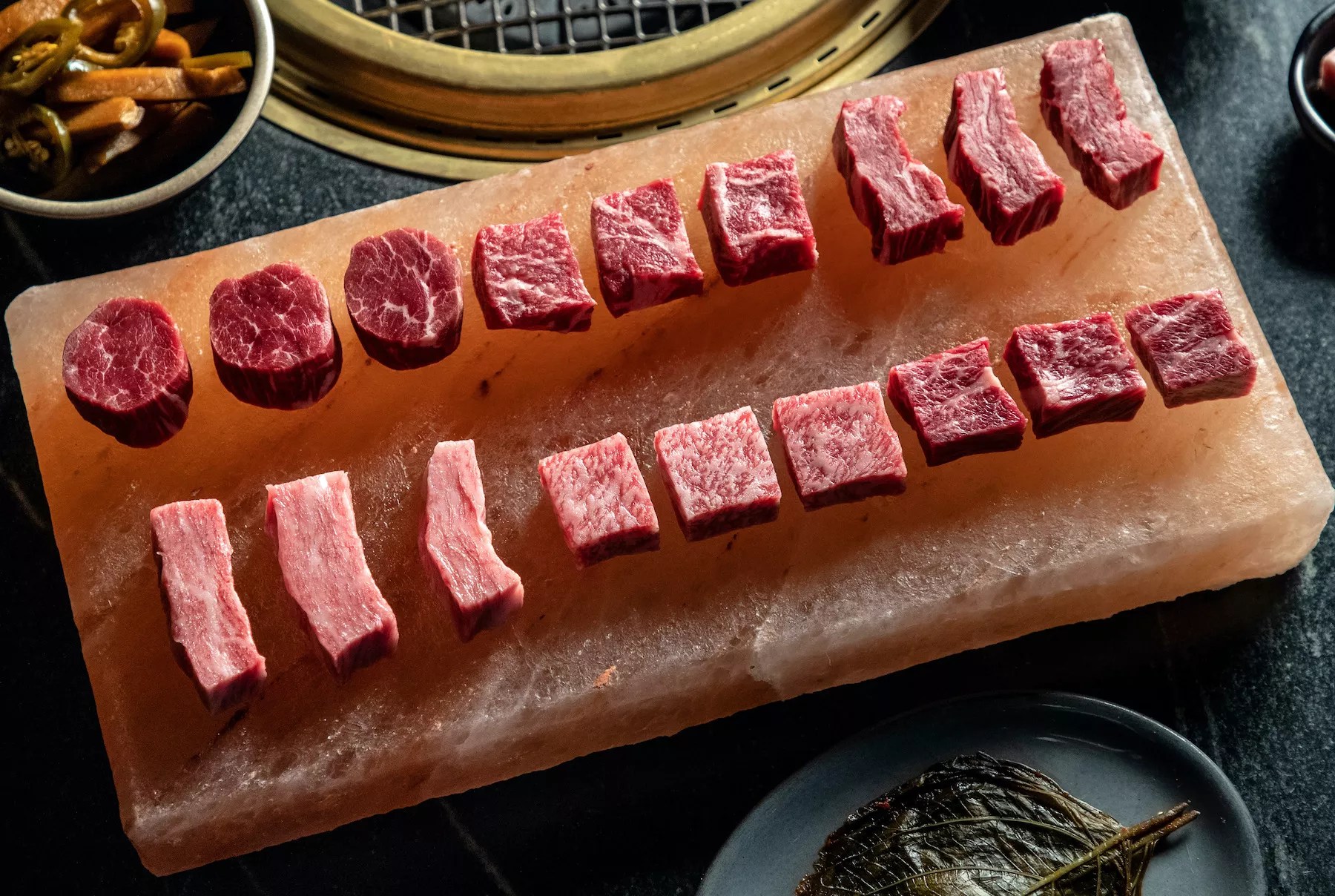 As at the New York restaurant, each table is equipped with its own smokeless grill. The dry-aged cuts are presented raw to show off their marbling and color, then cooked to order. The meats are paired with a variety of condiments, from a house kimchi to a ssamjang dipping sauce used for lettuce wraps.