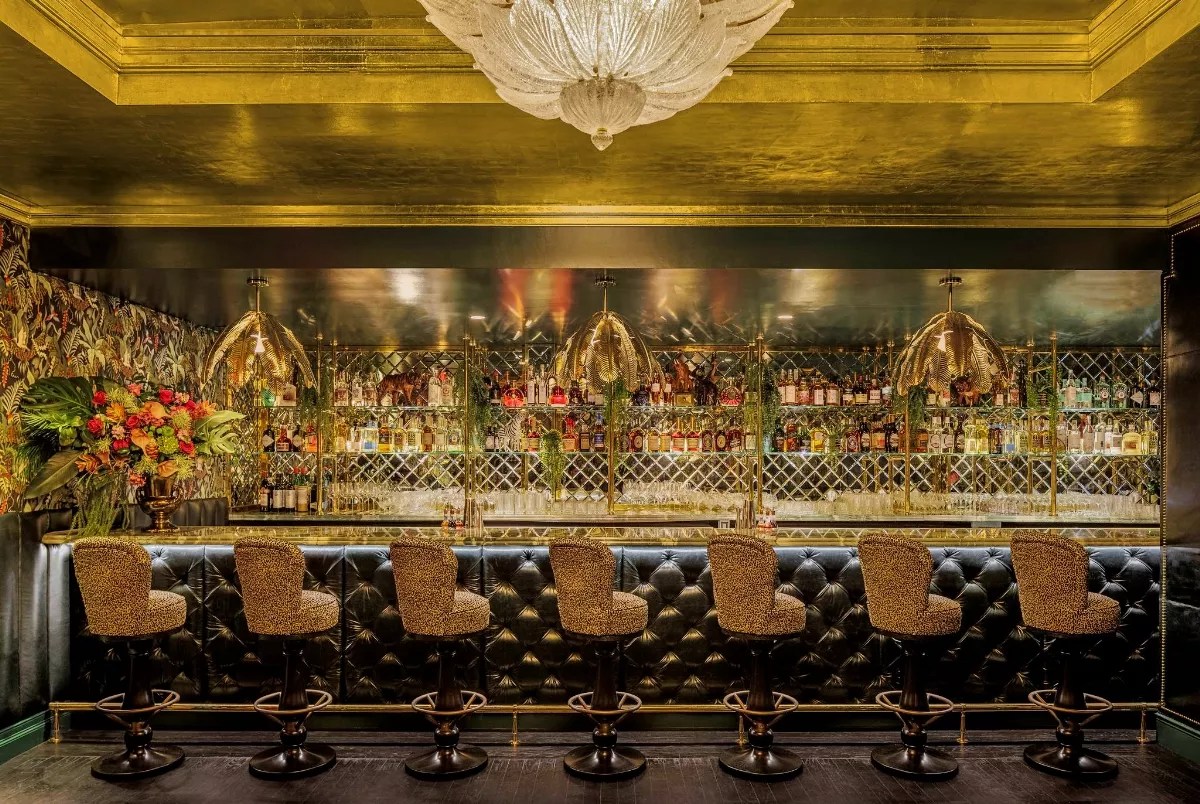 Upon entering, guests approach the Jungle Bar, decorated with gold-leaf ceilings, leopard-print bar stools, and banana-leaf lighting pendants. Get there a bit before your dinner reservation to sip down a martini before entering a long, dark, gilt corridor where a friendly leopard lounging under a gold palm tree will help you find your way to the dining room.