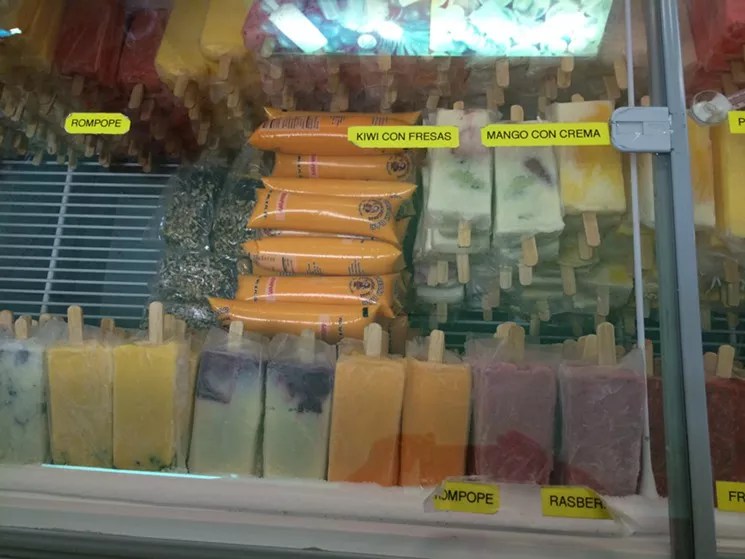 In a low-slung strip mall a block from Krome Avenue in Historic Downtown Homestead, the steel-and-glass front door of La Michoacana Paletería y Nevería swings open into an orange-and-gray-tiled shop. A half-dozen flat-screen TV sets blare Spanish-language news and telenovelas as you make your way to a long display case holding row after row of ice pops and cream bars. The $2 frozen treats come in a rainbow of flavors, such as blended mamey, sweet tomato salsa, or rompope — a popular Mexican drink similar to eggnog with ground almonds instead of booze.