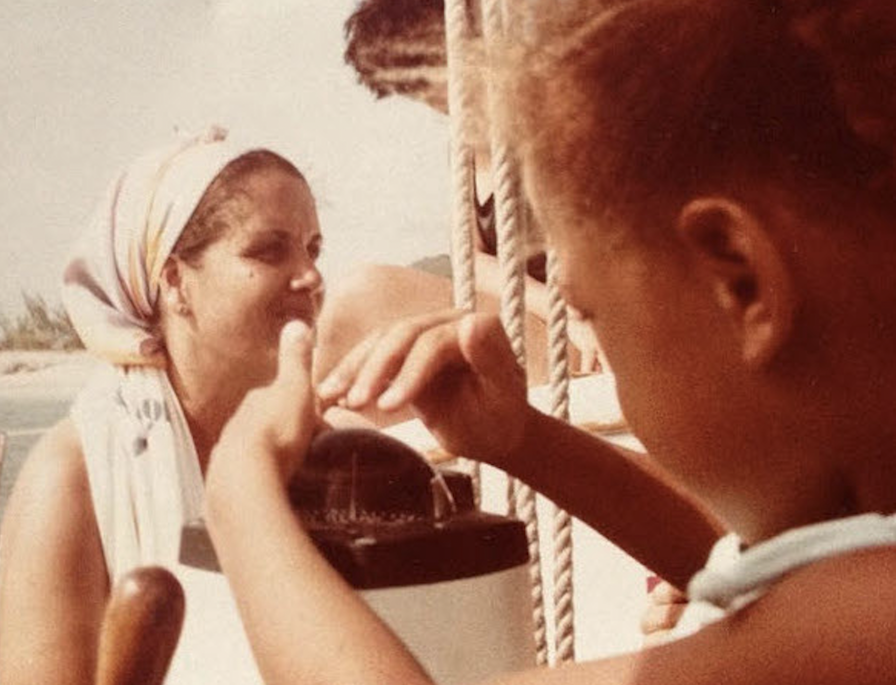 A photo of chef Nina Compton as a young girl and her mother in Saint Lucia looking at a compass. The always curious Compton learned to love cooking by watching her mother and grandmother.