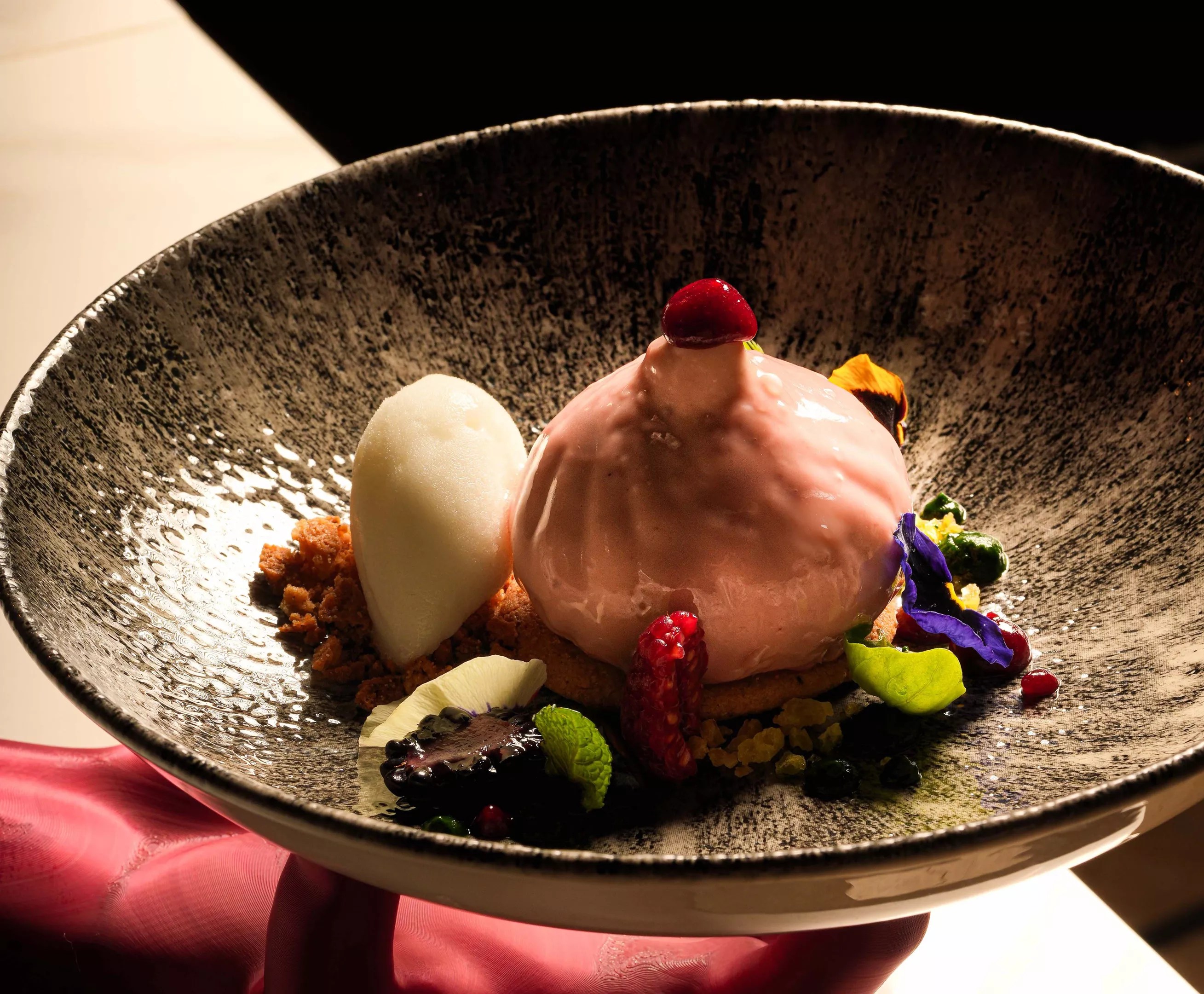 Other menu highlights include a vegetarian bao stuffed with eggplant, fior di latte mozzarella mousse, and walnut crumble served on a small plate shaped like a hand. Red shrimp carpaccio is paired with buffalo stracciatella and crisp potato chips, and a housemade pistachio gelato served in a playful plate shaped like bright red lips.