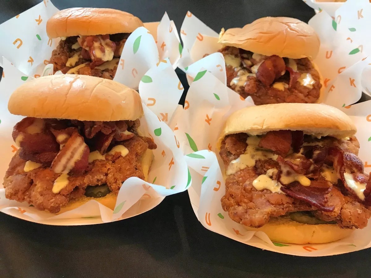 Other new additions to the Hard Rock Stadium food roster include Menchie’s Yogurt (sections 139 and 350), offering soft-serve ice cream cones and cups, along with a variety of toppings; and &Pizza (sections 142 and 345), a D.C.-based pizza company that bakes fresh, oblong-shaped, thin-crust pizzas. This is the first South Florida location for &Pizza, which has locations throughout the Mid-Atlantic and Northeast states. Fuku’s new sandwich. Laine Doss
