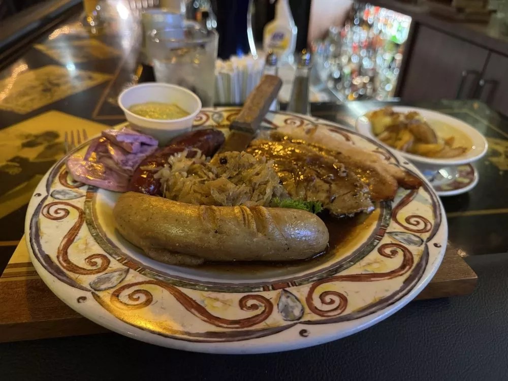 “Bayrische Schmankerlplatte,” the Ambry’s bratwurst, knockwurst, and roast pork with house gravy, sauerkraut and potatoes.