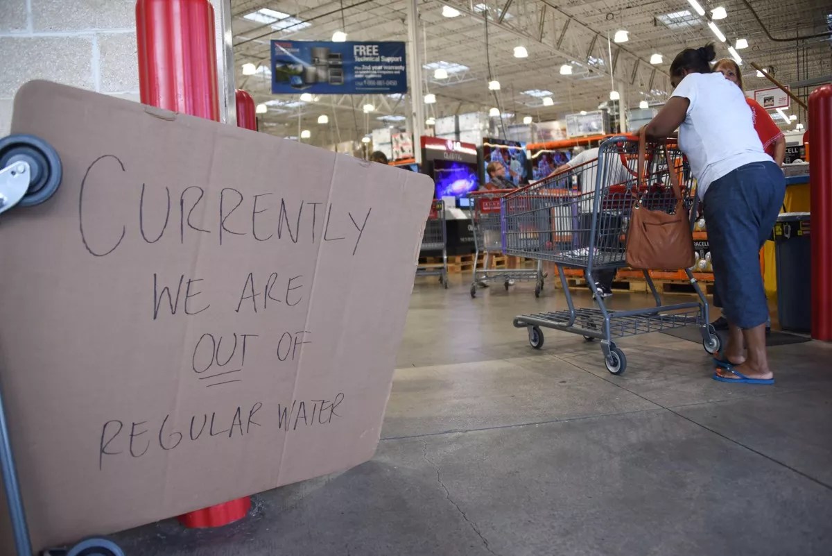 The brewery has a pallet of filtered water; the limit is one case per person until supplies last. Customers can also fill empty growlers and jugs at the brewery’s water stations.