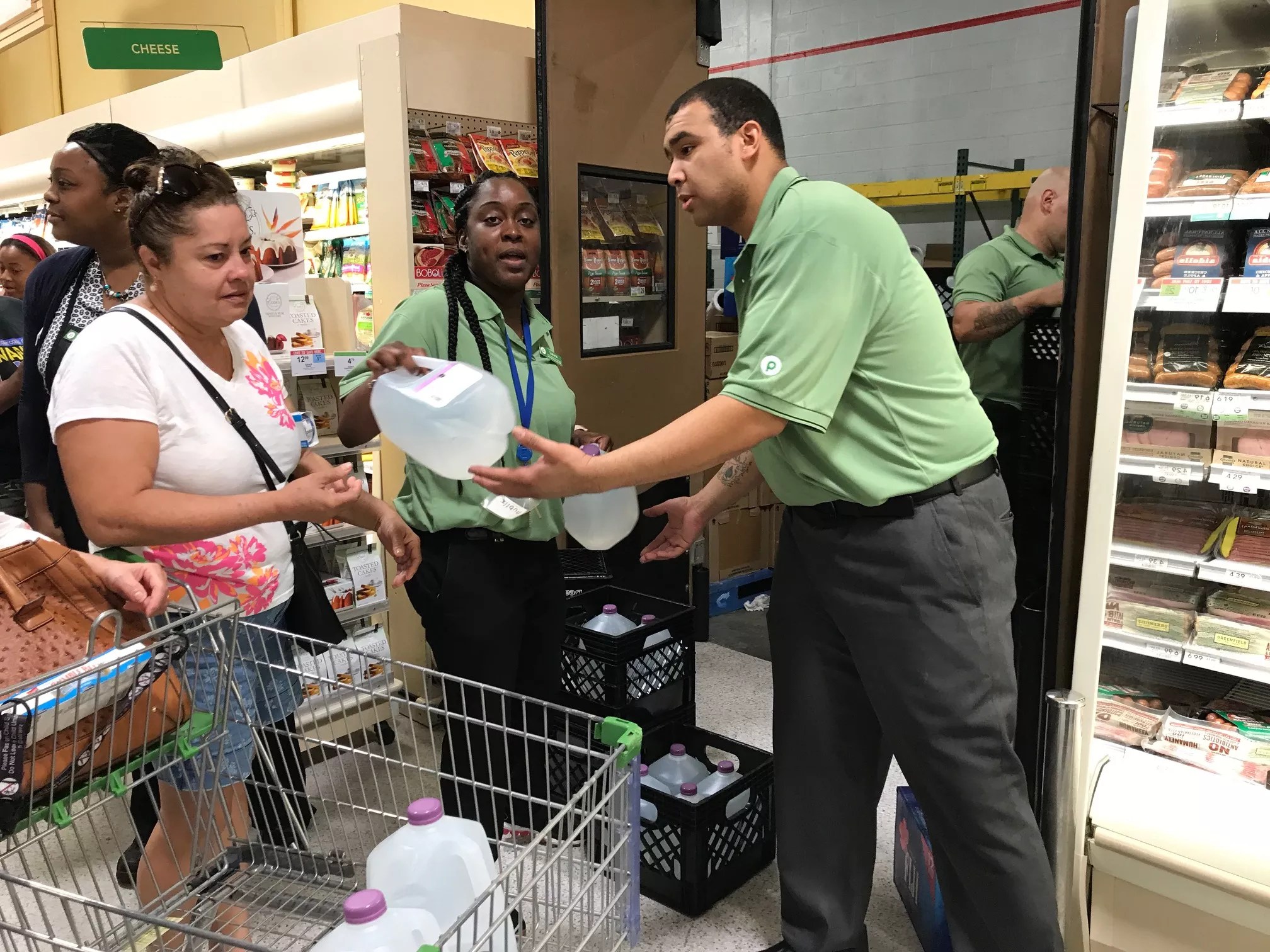 The wind is starting to pick up although the skies are sunny as people file in the Publix on Biscayne and 90th in Miami Shores just about noon. Inside, a police officer, dressed in riot gear, instructs shoppers to walk through a designated entrance, since much of the store is already boarded up against the coming storm. Water is stacked up and the officer is guarding it. A line queues for the water, handed out by store managers.