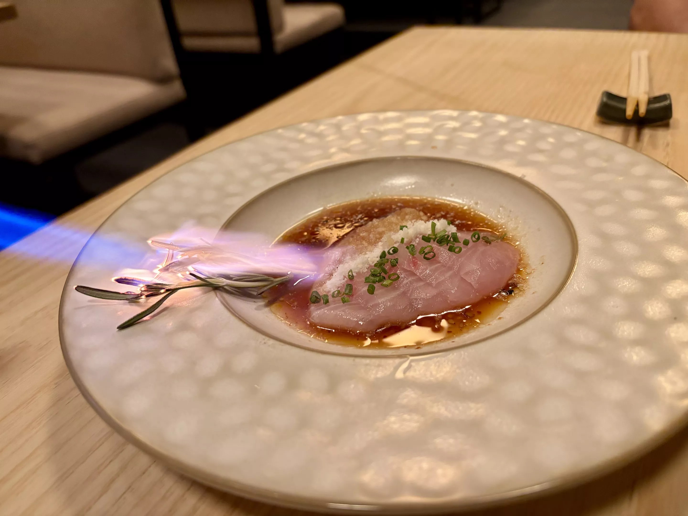 Among the signature dishes, there’s the smoked kampachi, served with truffle ponzu, diced apple, and shaved Pecorino cheese—finished tableside by torching a rosemary sprig on the plate.