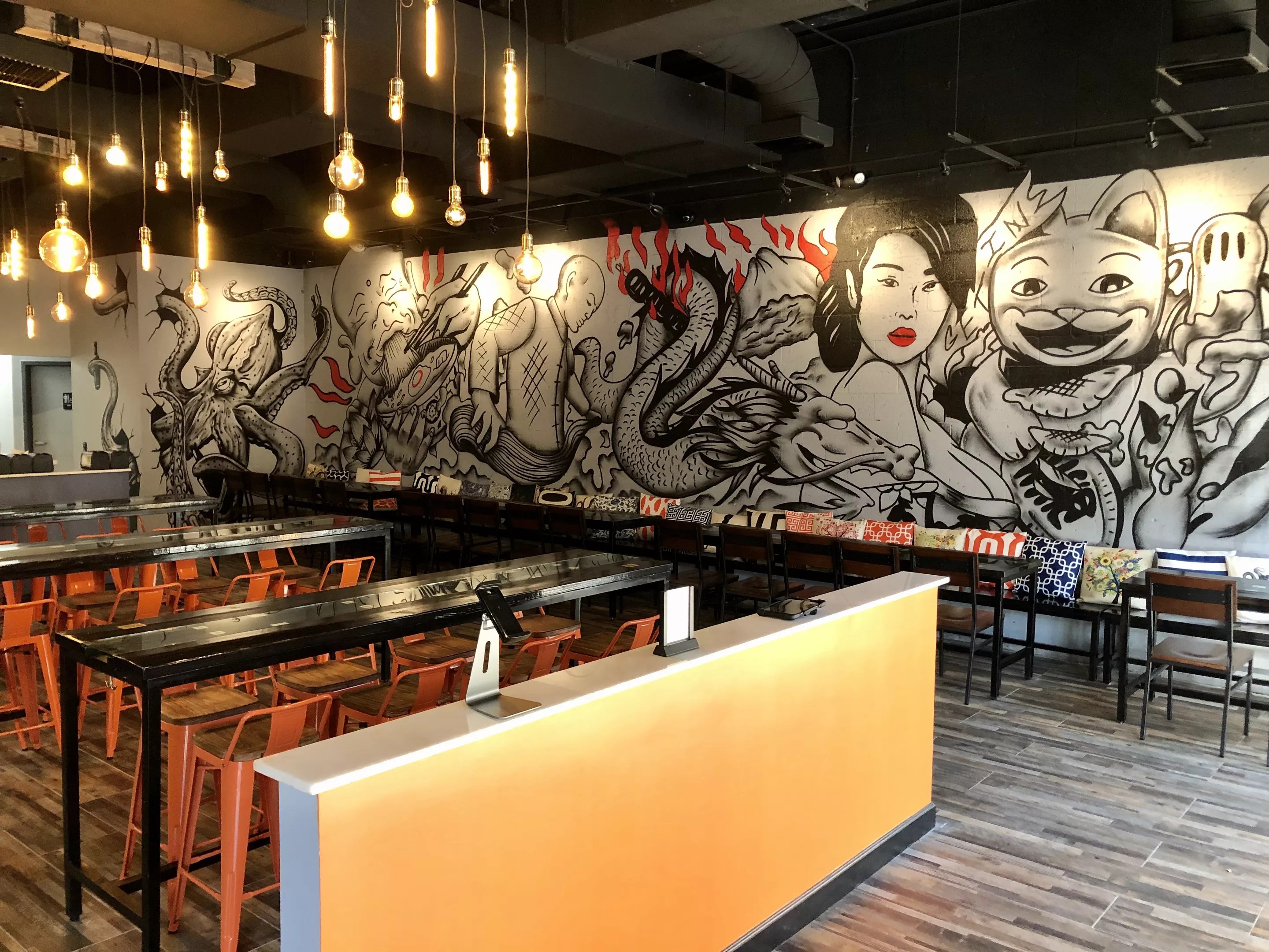 The interior decor of InRamen includes a mural by Miami artist Ivan Roque.