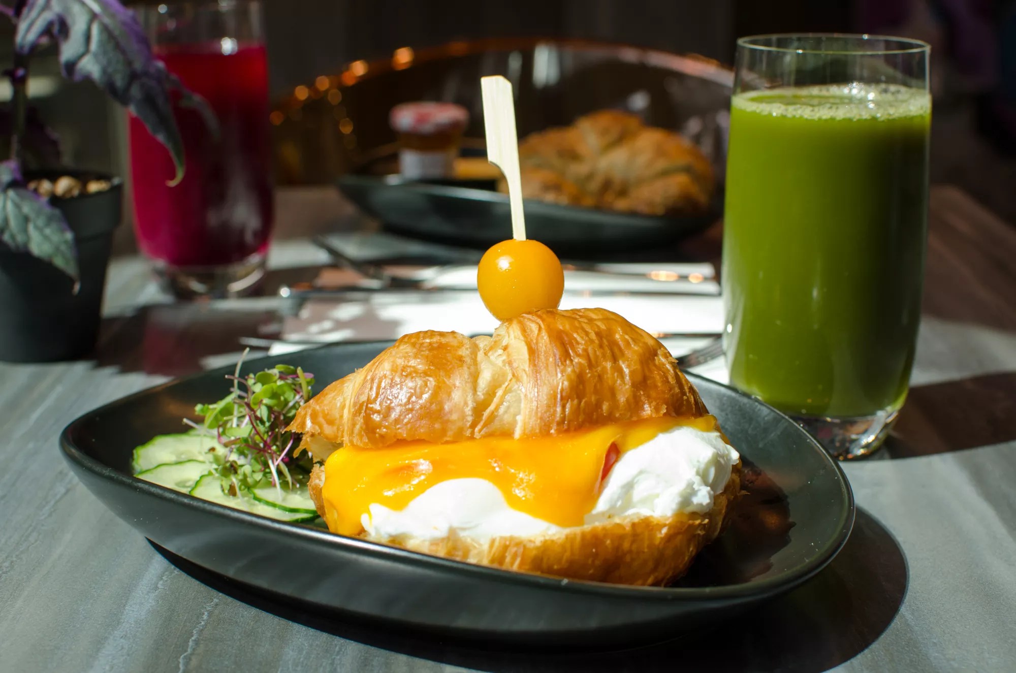 Beginning at 7:30 a.m., LaMuse prepares a lineup of tartines including avocado, roasted tomato, and poached egg ($13); pear and goat cheese ($11); butternut squash and ricotta ($13); and smoked salmon ($13). House-made pastries include tarts such as apple, lemon meringue, and fresh berries; almond croissants; and egg puff pastries. LaMuse’s croissant-sub sandwich. Courtesy of LaMuse Cafe