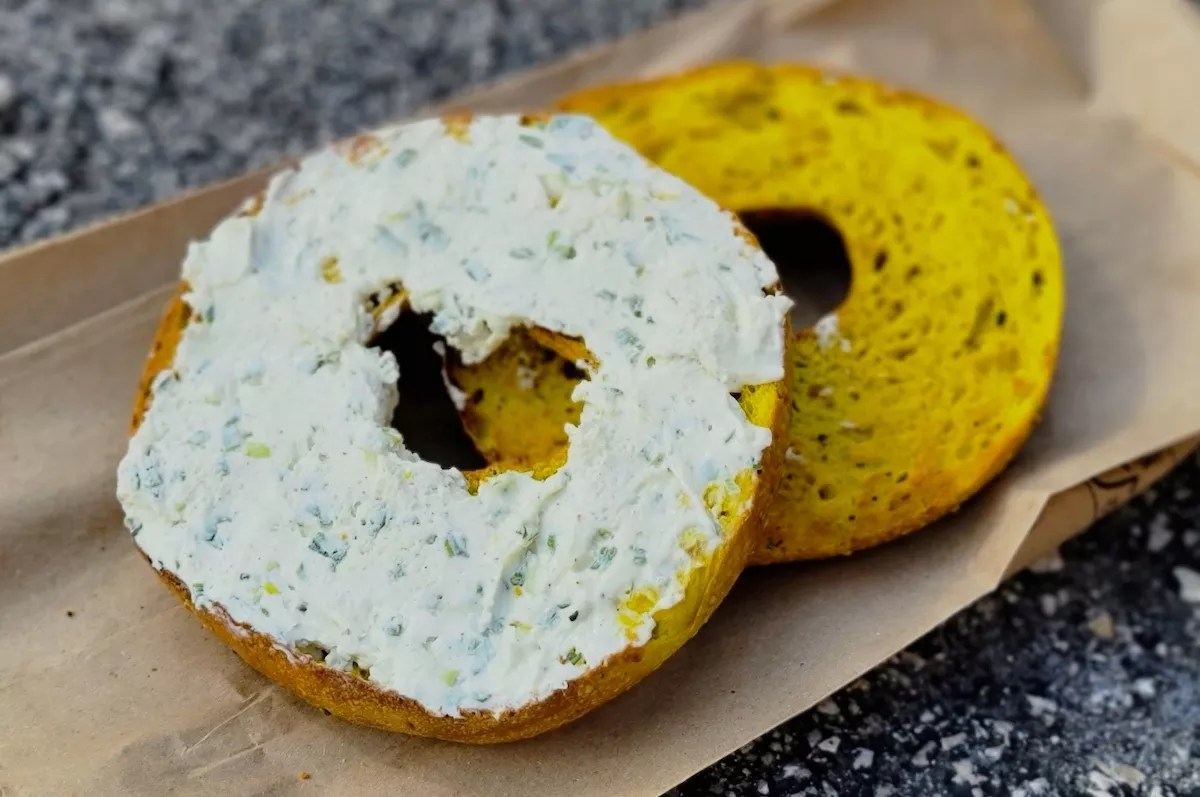 The turmeric-everything bagel with scallion and black pepper cream cheese from LNB Grovestand