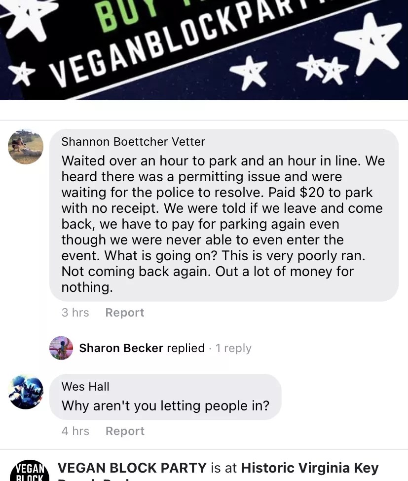 Complaints mount on Vegan Block Party Facebook page.