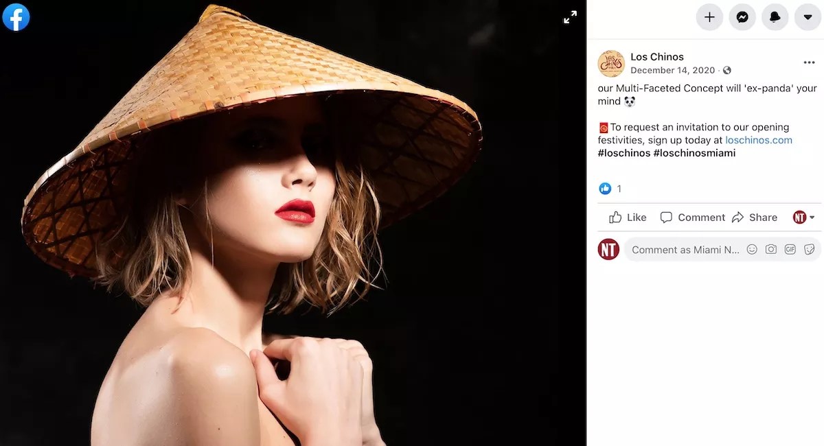 A woman is depicted in an Asian conical hat in a Facebook post from Los Chinos.