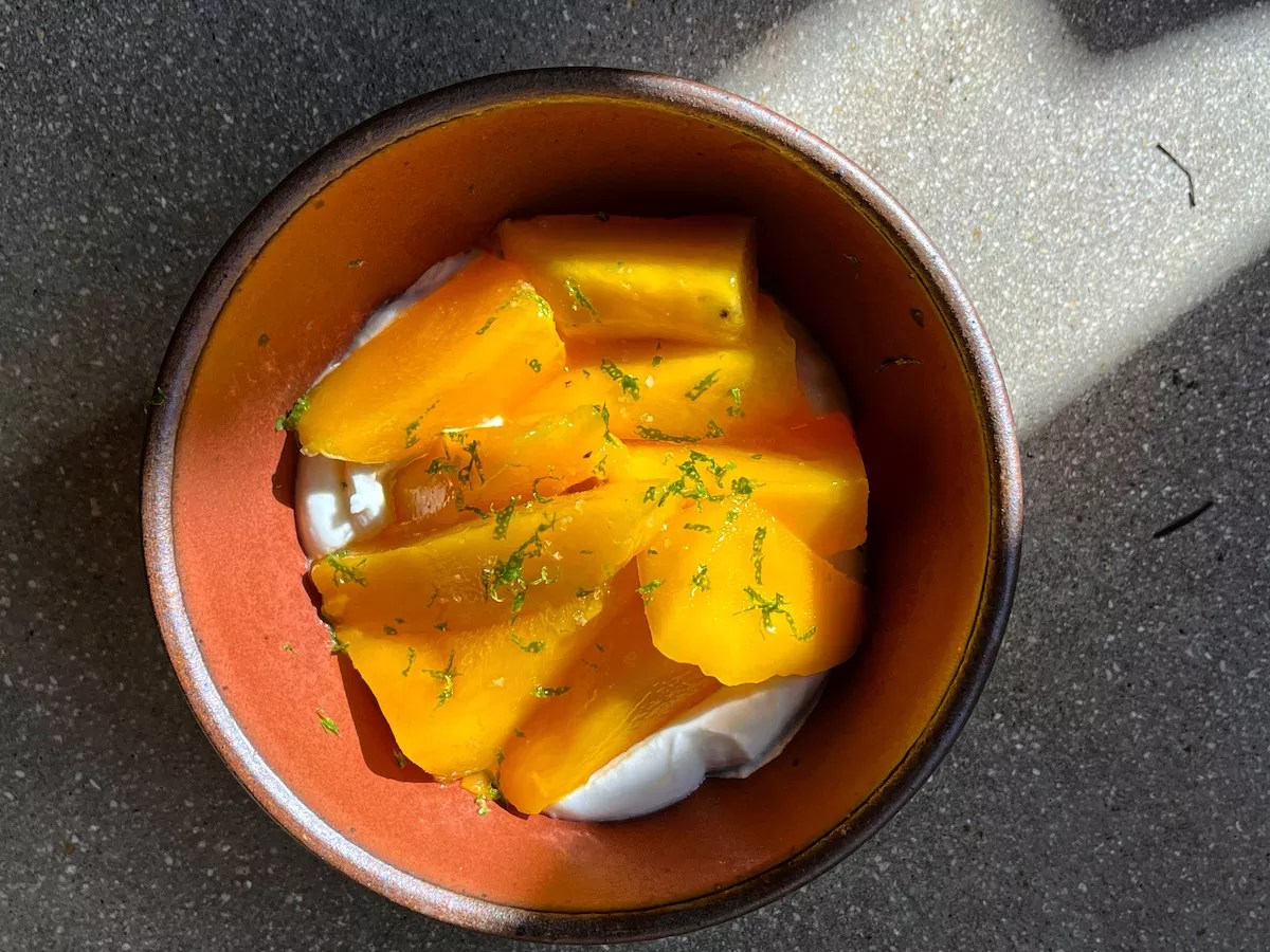 A mangos-and-cream dessert became the first dish in what Paradis’ owners dubbed on social media the “Major Mango Menu Takeover.” The dessert ($6) starts with a spiced rum cream, topped with fresh mango cubes, and finished with flaky salt and the juice and zest of a lime. “We wanted that to be like a celebration of super fresh mangos,” Wright says. “So we cut those up only a few hours before we serve them.”