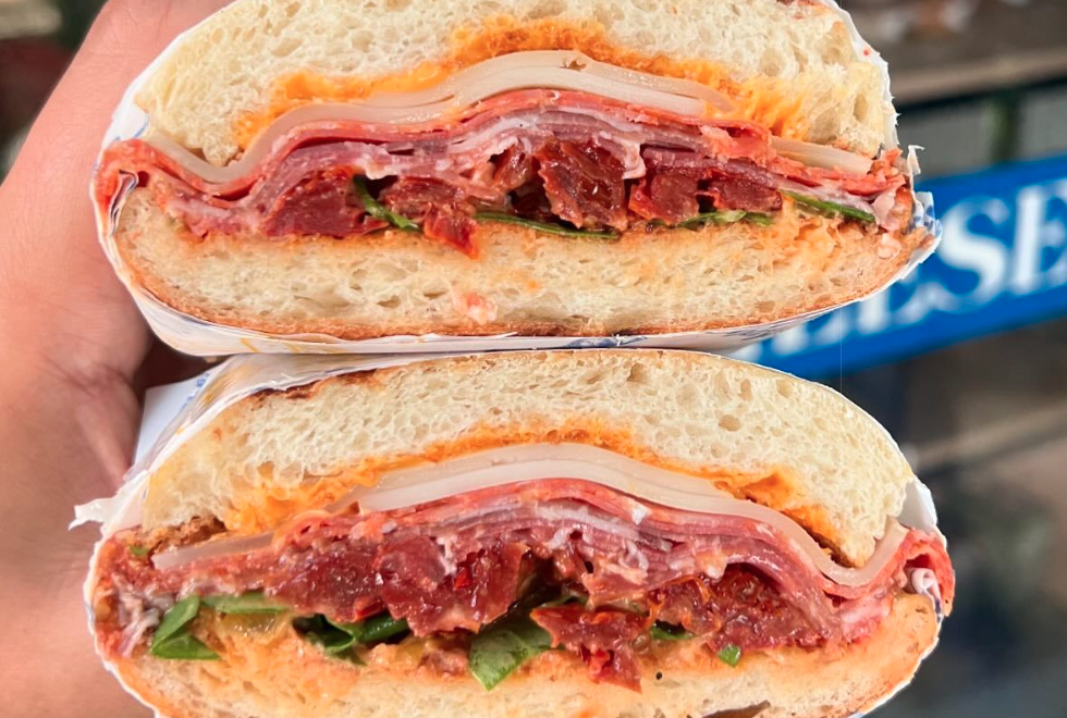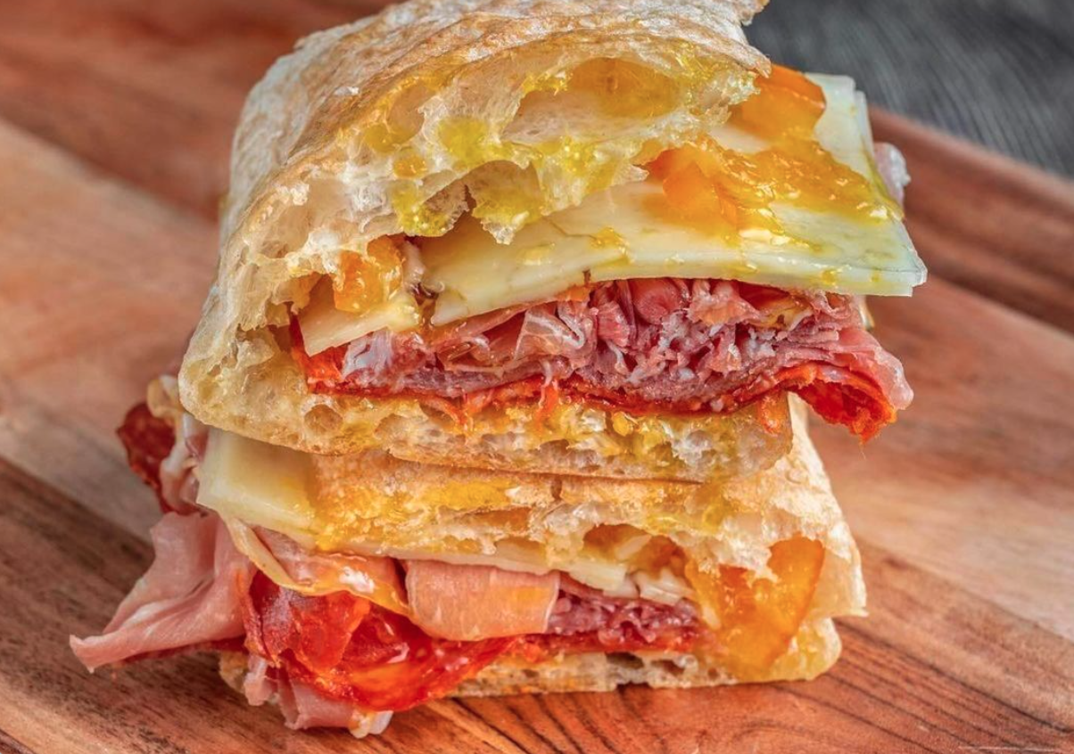 Or, try the “Gabagool” made with mezzo doppio bread, hot soppressata (spicy, dry-cured Italian pork sausage), capicola (also known as “coppa,” a traditional Italian cold cut of dry-cured pork), spicy coppa, tomato confit, aged provolone, sun-dried tomato, a sriracha-Japanese mayo sauce, and fresh arugula.