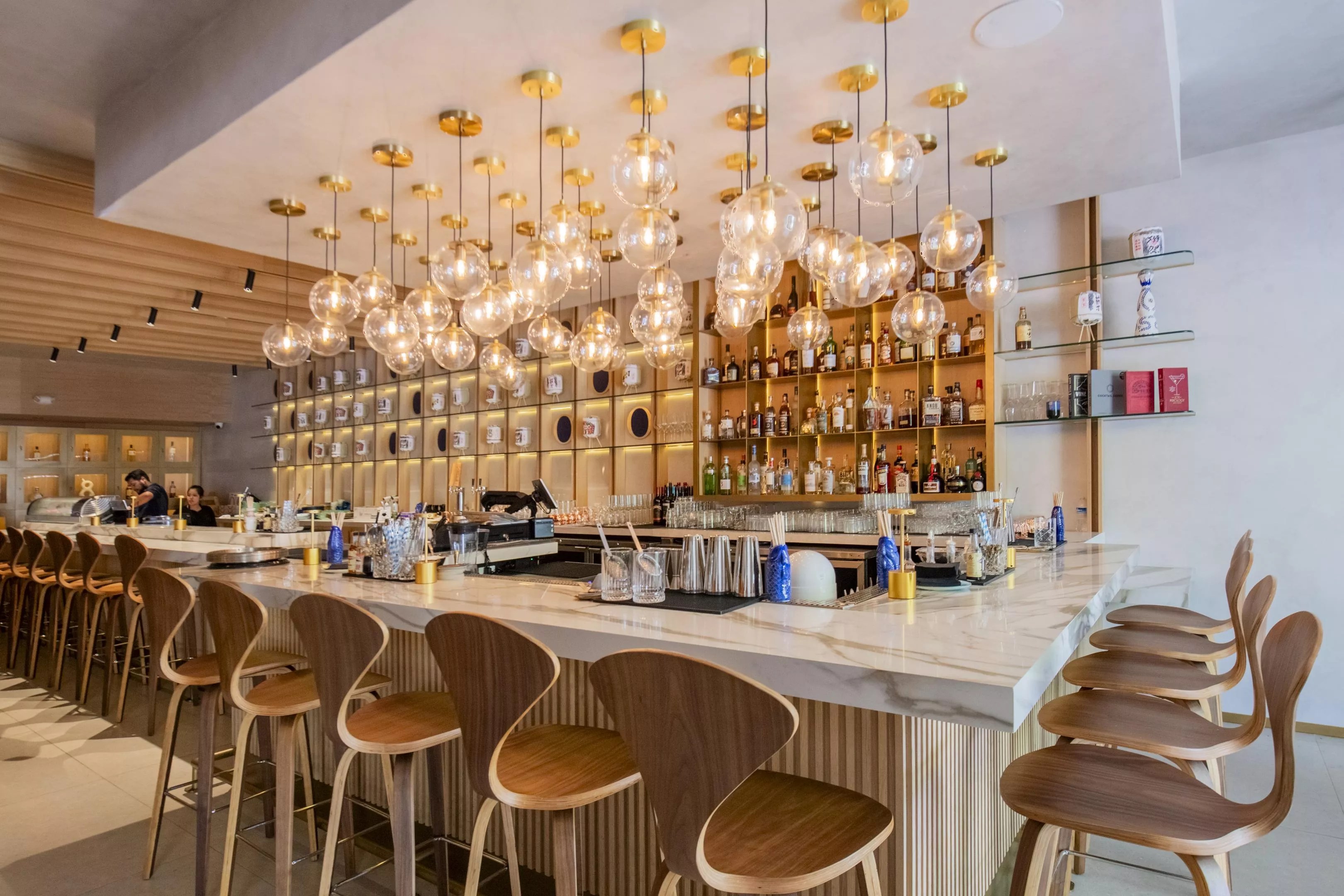 The marble bar at Osumi Cocktail & Sushi Bar has an impressive collection of Japanese whiskey and cocktails.