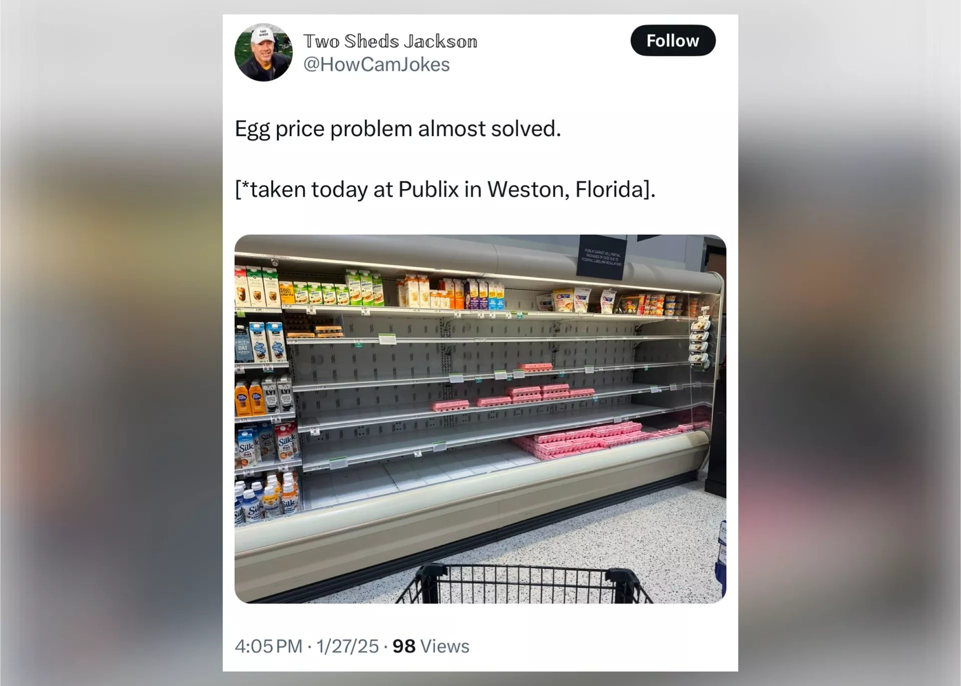A post on X shows nearly empty shelves where egg cartons once were at a Publix in Weston, Florida.