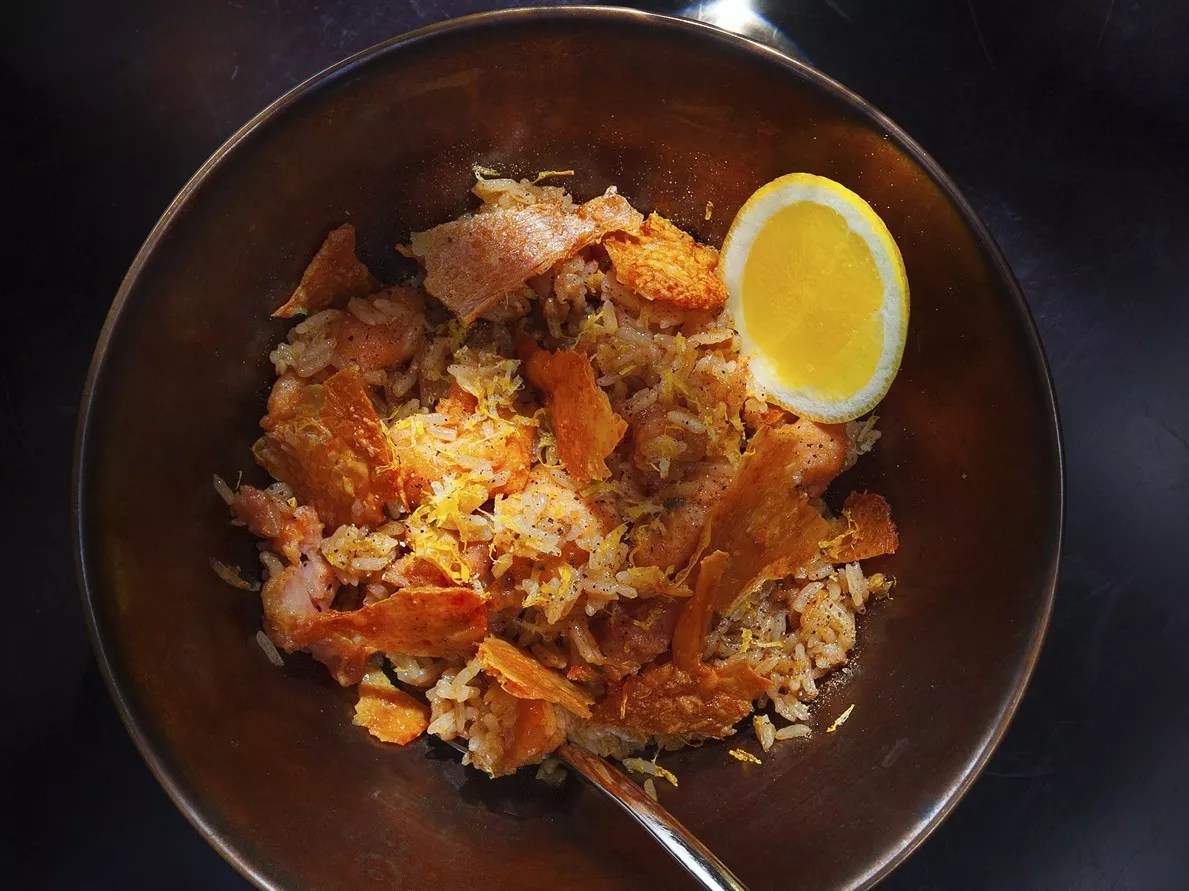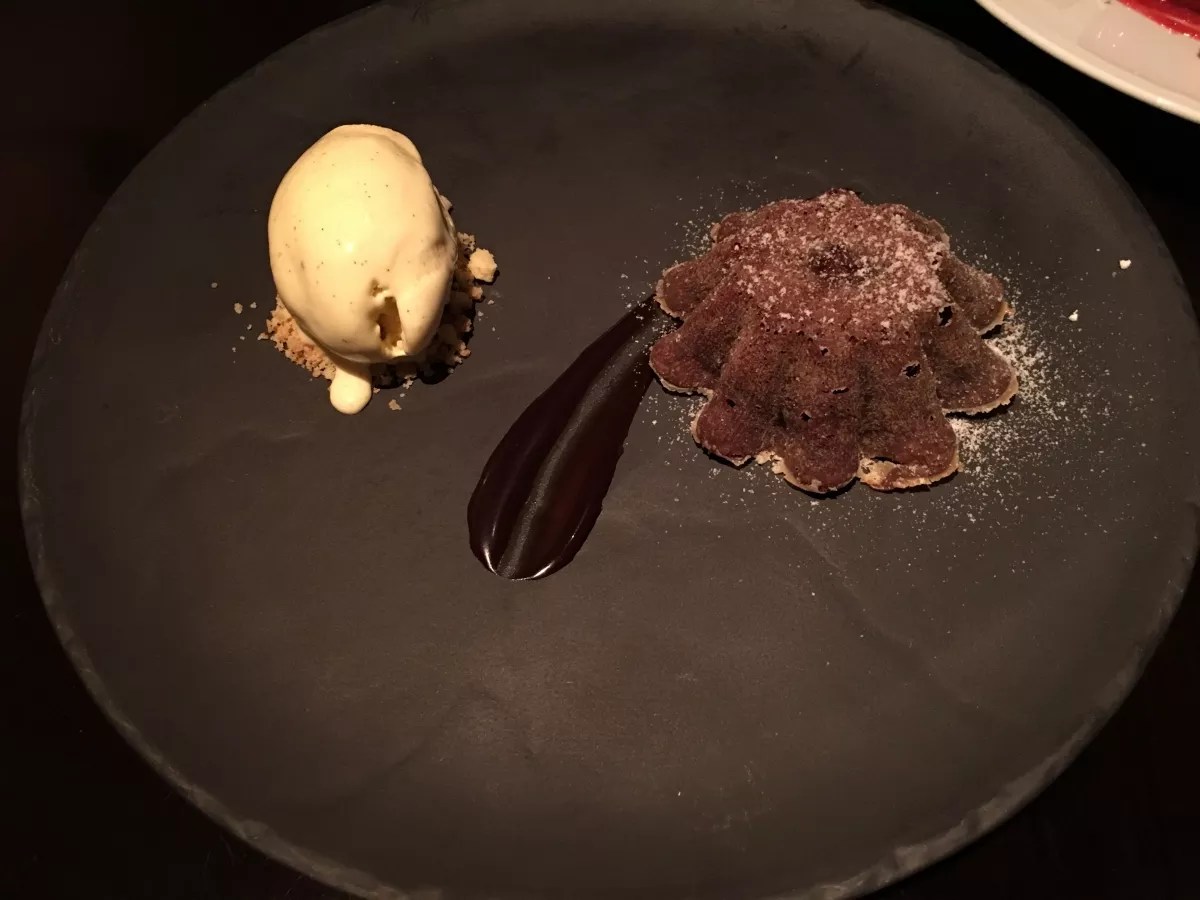 Another signature entrée on the Spice menu is the arroz con pollo. The jasmine rice resembles a creamy risotto in taste and texture, while brined dark and white chicken meat are flash fried and submerged in a broth of kombu (edible kelp) and rosemary before being placed in the oven. Lemon zest, black pepper, and crackling slices of lightly salted chicken skin make JG’s twist on the Latin classic a bona fide winner. Simply squeeze some lemon over it and dig in. Come with a party of three so you can try the third main-course option: a mushroom and three-cheese pizza crowned with a farm-fresh egg.
