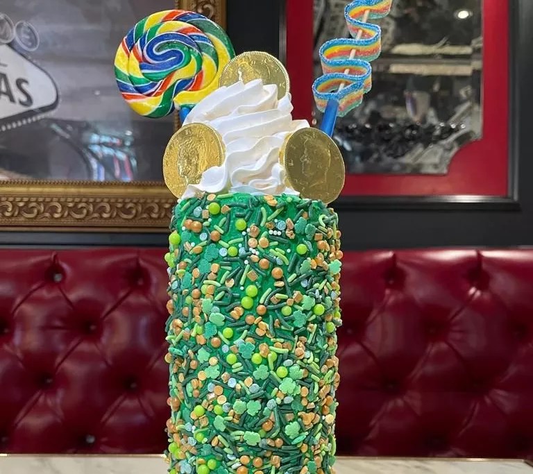 Celebrate St. Patrick’s Day with Sugar Factory’s “Lucky Leprechaun” milkshake. This limited-edition Irish coffee-flavored shake is made with vanilla and coffee ice cream, Jameson whiskey, and green sprinkles, topped with whipped cream, gold coins, rainbow sour belts, and a rainbow whirly pop ($25). The shake is available through March 31.