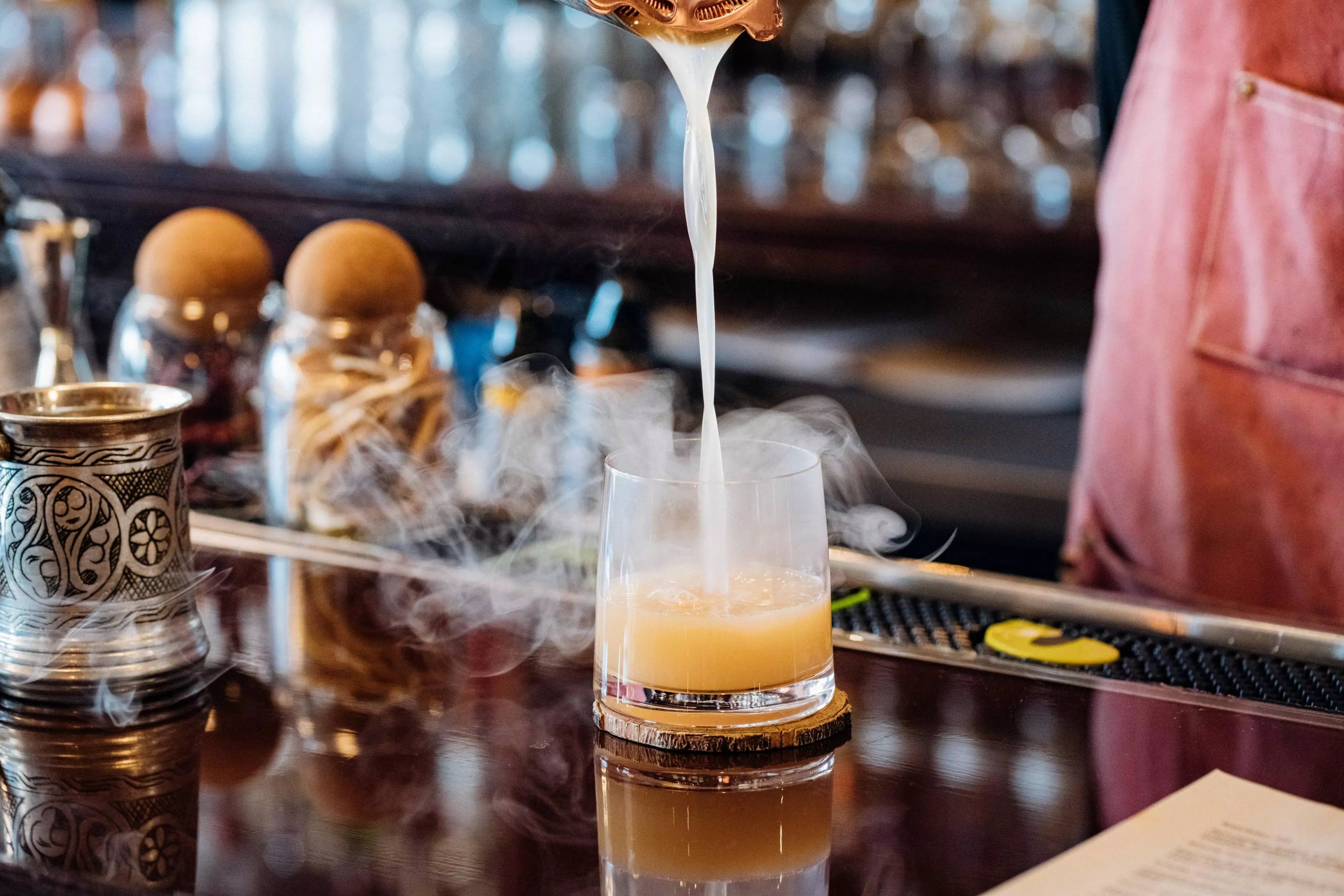 The “Smoke on the Water” cocktail is made with mezcal, amaro bitters, lemon juice, simple syrup, spicy bitters, and grapefruit juice.