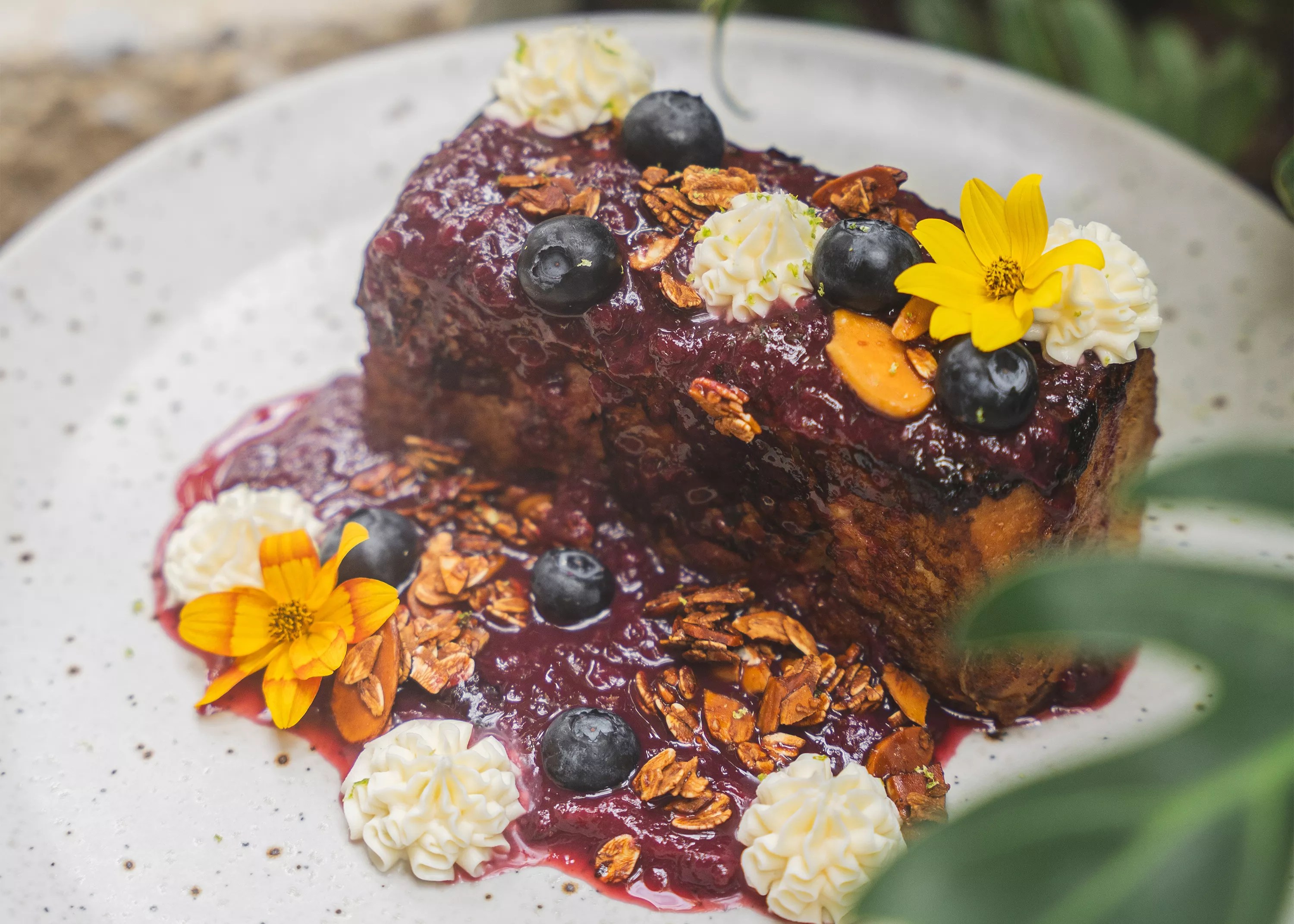 The yuzu French toast at Flora Plant Kitchen is made of housemade brioche French toast, berry compote, yuzu mascarpone, and an almond oat crumble.