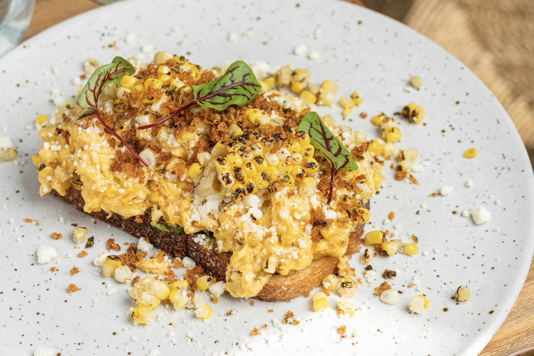 Two other savory dishes to choose from are the “Cactus Elotes,” which is charcoaled corn that comes topped with chipotle guava aioli, spicy aioli, cotija cheese, and paprika breadcrumbs, as well as the “Brunch Hamburguesa,” a plant-based burger on a brioche bun stacked with truffle aioli, cheddar cheese, sunny-side-up, free-range eggs, mixed greens, avocado, heirloom tomatoes, and caramelized onions, served with heirloom fingerling potatoes. On the sweet side, options include a yuzu French toast and Japanese-style peach soufflé pancakes layered with Amaretto-flambéed peaches, orange ricotta, toasted shaved almonds, and powdered sugar.