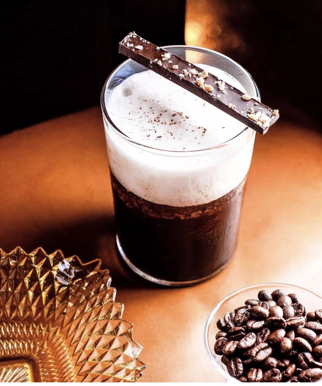 The Stay Woke ($19) at Miami Beach’s Matador Room combines Havana Club rum, St. George coffee liqueur, a splash of cold brew, cardamom, toasted peanuts, banana foam, and nutmeg in a glass garnished with house-made chocolate bark.