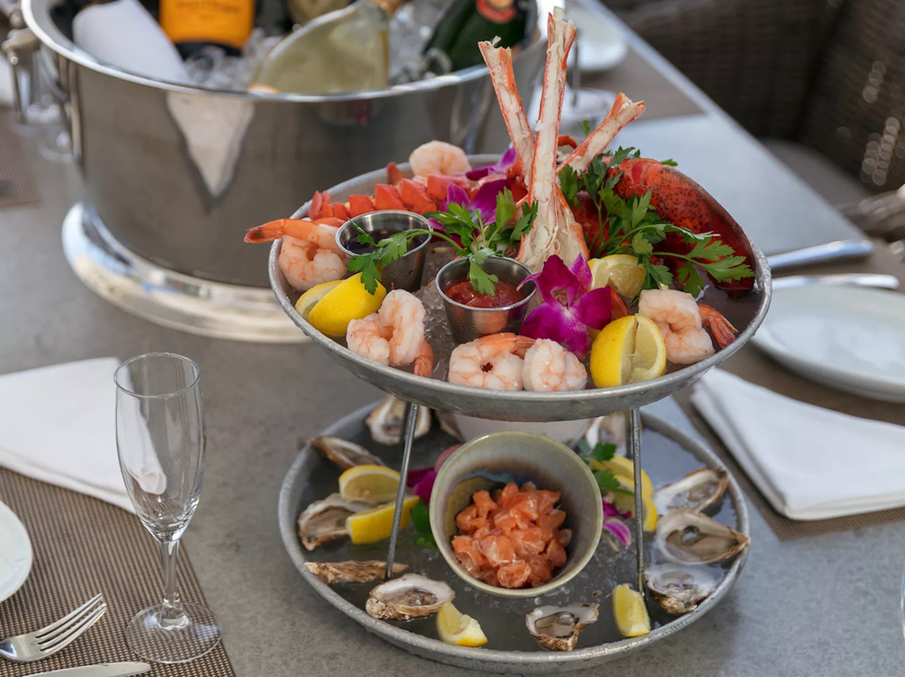 For a limited time, buy a bottle of Veuve Cliquot and get a free seafood tower at The Deck.