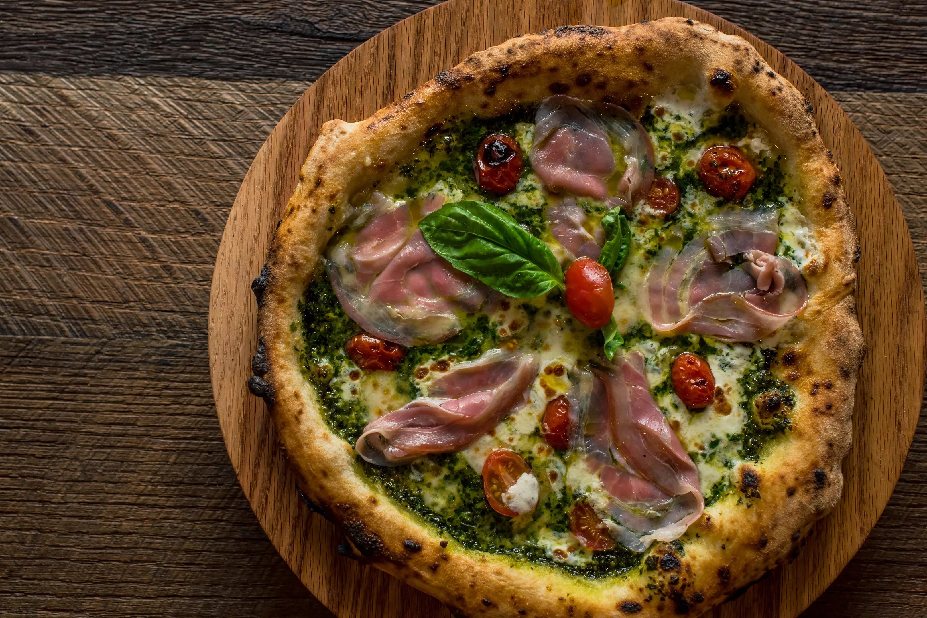 “I’ve lived in Naples and made pies there. I know what Neapolitan pizza is,” Di Palma says. “Mine are a combination of those centuries of tradition and little elements of what you’d find in one of Lucali’s pies.”
