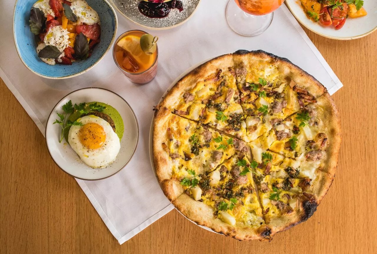 Begin with a handful of small dishes. Some of the restaurant’s best sellers are the crispy chickpea, a fried egg with spiced parsley aioli served atop a crunchy, falafel-like patty ($9); creamy avocado toast with a poached egg on multigrain ($10); lemon ricotta pancakes with blueberry compote ($8); and smoked wild salmon crostini finished with citrus, basil, ricotta, radish, and capers ($15). A scoop of chilled overnight oats, served in a tall glass, bursts with fruity, nutty, and maple flavors ($9). Breakfast pizza Courtesy of Fi’lia