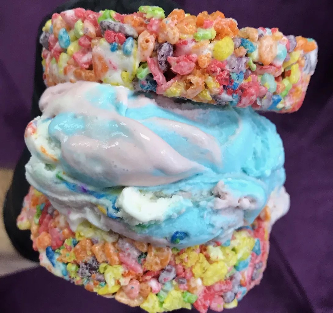 Among the shop’s specialties are the bubble waffle supreme, a hot waffle rolled into a cone with two scoops of ice cream and unlimited toppings ($11.99); a whimsical fruity pebbles ice cream sandwich ($7.99); and the custom Nutella-filled sugar cone brownie sundae ($10.99). There’s also the cinnamon waffle sundae ($12.29) and the Maria cookie trio with three mini guava ice cream sandwiches ($7.49). A regular milkshake costs $7.99 and cereal shakes cost $9.35.