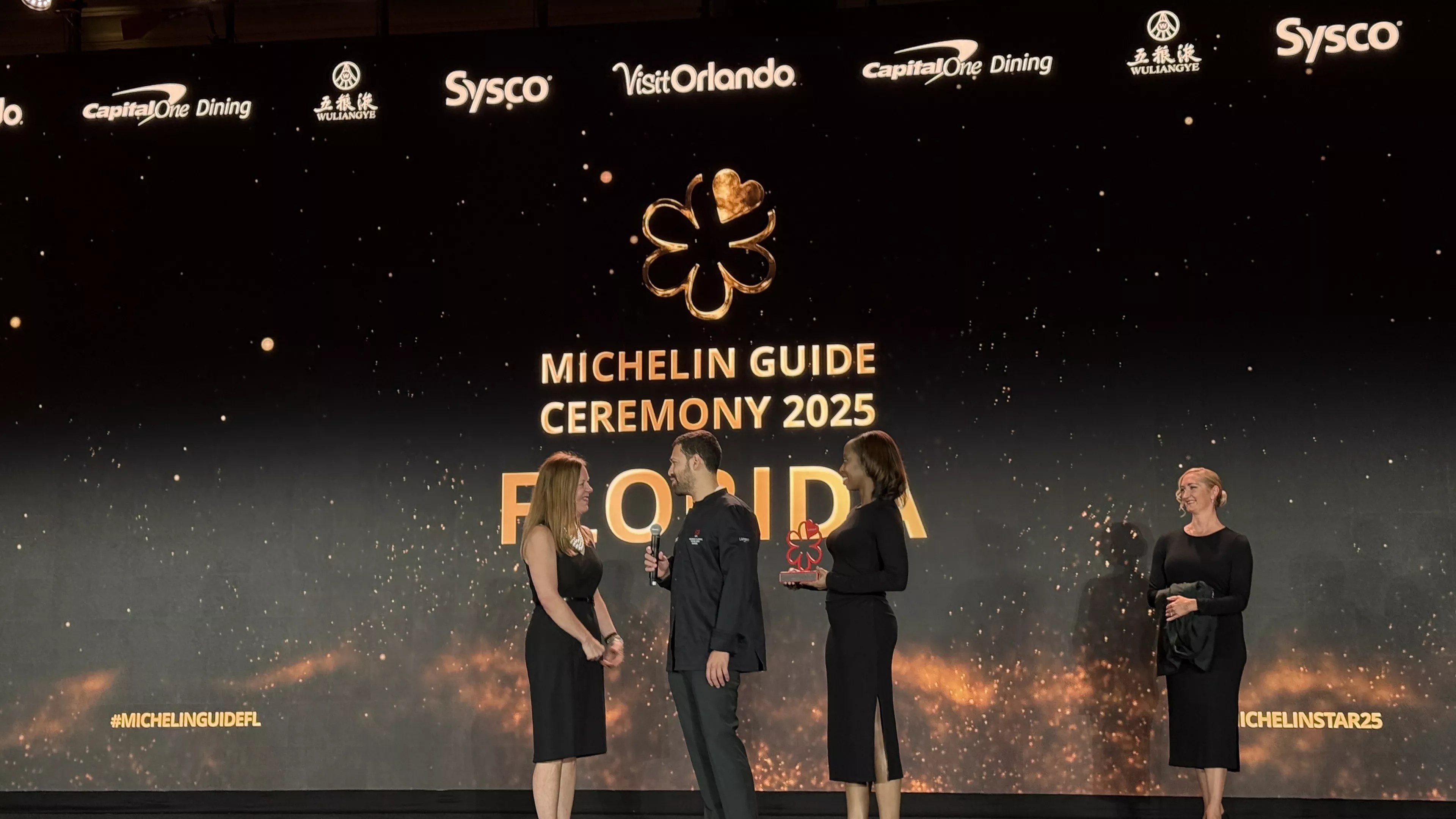 The anonymous inspectors awarded 31 restaurants Michelin Stars in total, with Sorekara in Orlando being the newest two-Michelin-starred restaurant. This year’s selection also welcomed two new Green Stars in Miami, with EntreNos and Stubborn Seed recognized for their efforts in sustainable gastronomy. The full selection, including Bib Gourmands and recommended restaurants, totals 172 eateries spanning 39 cuisine types. The full list of winners on the stage at the 2025 Florida Michelin Guide Awards in Orlando, Florida, on April 17. Photo by George Arango