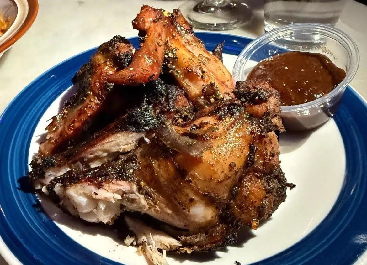 Hall’s jerk chicken wings served with house-made sweet jerk barbecue sauce, and slow roasted jerk pork.