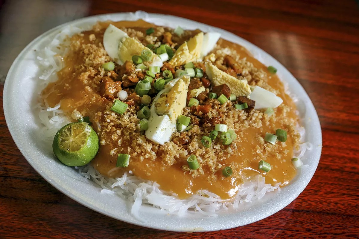 The most memorable dishes were dinuguan and sisig, also known as pork blood stew and stir-fried pig face. For the stew, pieces of pork are marinated in vinegar, salt, garlic, and bay leaves. Next the blood is very gently heated and, as it warms, the pork and its seasonings must be quickly stirred in. The process creates a rich, not too iron-tasting emulsion that rivals hefty soups like Greece’s avgolemono and New England’s clam chowder. Pancit palabok Photo by CandaceWest.com