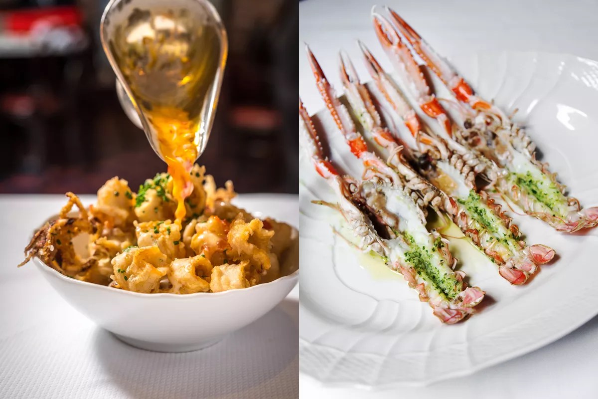 The calamari () and shrimp scampi () at Carbone.
