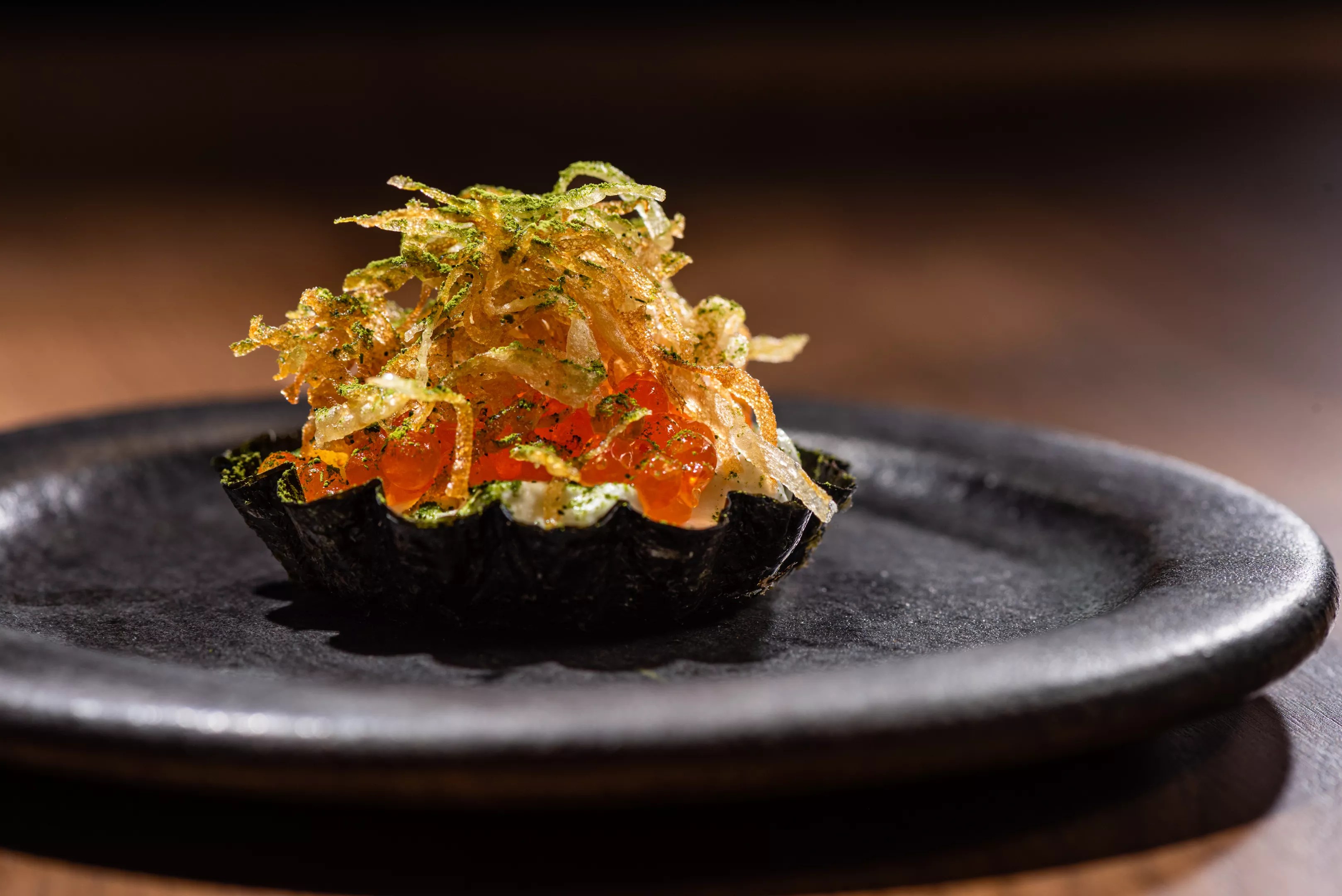 Moreover, the restaurant is eccentric and laid-back, with hand-painted lion frescoes by Canadian muralist Derkz, plates crafted by independent ceramists, and French cutlery. Yet it’s also moody, with dark polished woods and ambient lighting. Plus, it has 42 table-top seats as opposed to the 10 or 12 counter-top spots many tasting lairs have.