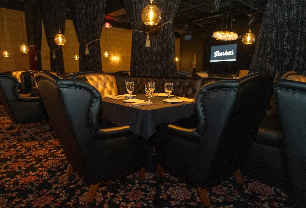 Shawn Barnes, general manager of Scarlett’s, designed a décor reminiscent of an upmarket speakeasy, adorning the dimly lit space with black and gold leather couches and banquettes, marble tabletops streaked with black and gold, a black felt pool table, and gold chandeliers.