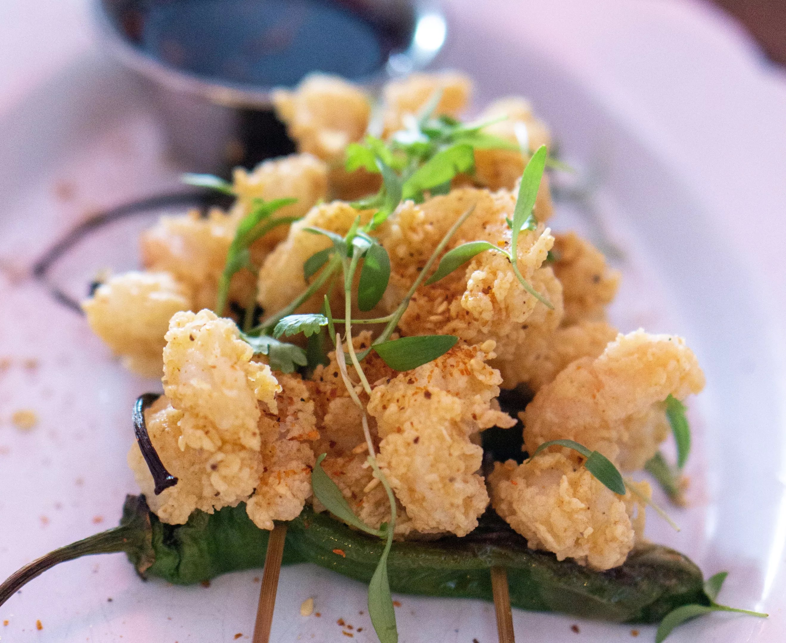 Newly added shishito peppers are the perfect finger food, topped with flash-fried Gulf shrimp.